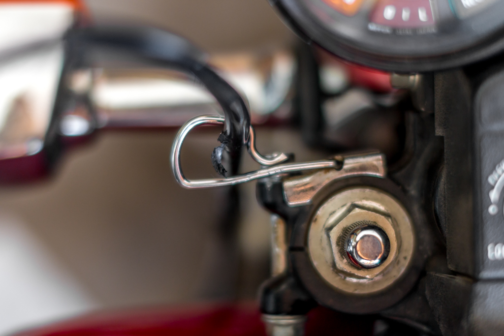 In other news my clutch cable kept getting snagged and torn up by the mounting/clamping bolt head every time I turned to the right. I tried to solve it by moving the clutch lever up the handlebars an inch and it did help, but the cable was still being damaged by the bolt head. So since the guide was already screwed up pretty badly (see pic of gages earlier) I bent and extended the guide out and away from the bolt head. The aftermarket handlebars just extended the clutch lever just a bit too far, but now it should work well with no worries.