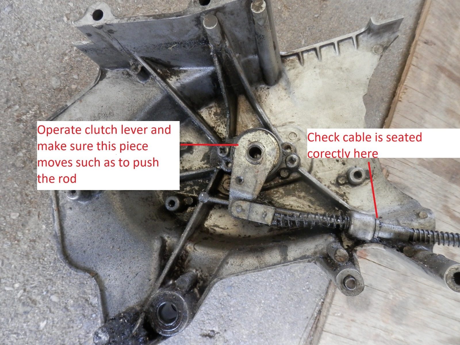 Make sure the clutch release mechanism is cleaned, lubricated & operates normally. and is oriented correctly & properly installed w bolts securing it to the engine sprocket cover. make sure the clutch cable is properly routed & seated into the engine sprocket cover and release mechanism. one little goof & it won't work. Be sure to install a small cotter pin so that the cable end remains seated. When reinstalling the engine sprocket cover, I like to maintain tension on the clutch cable so that the cable end remains seated. Also, I place the engine sprocket cover on shipping boxes beside the motorcycle so that the clutch cable doesn't get kinked or anything. and so the cover doesn't get scratched.