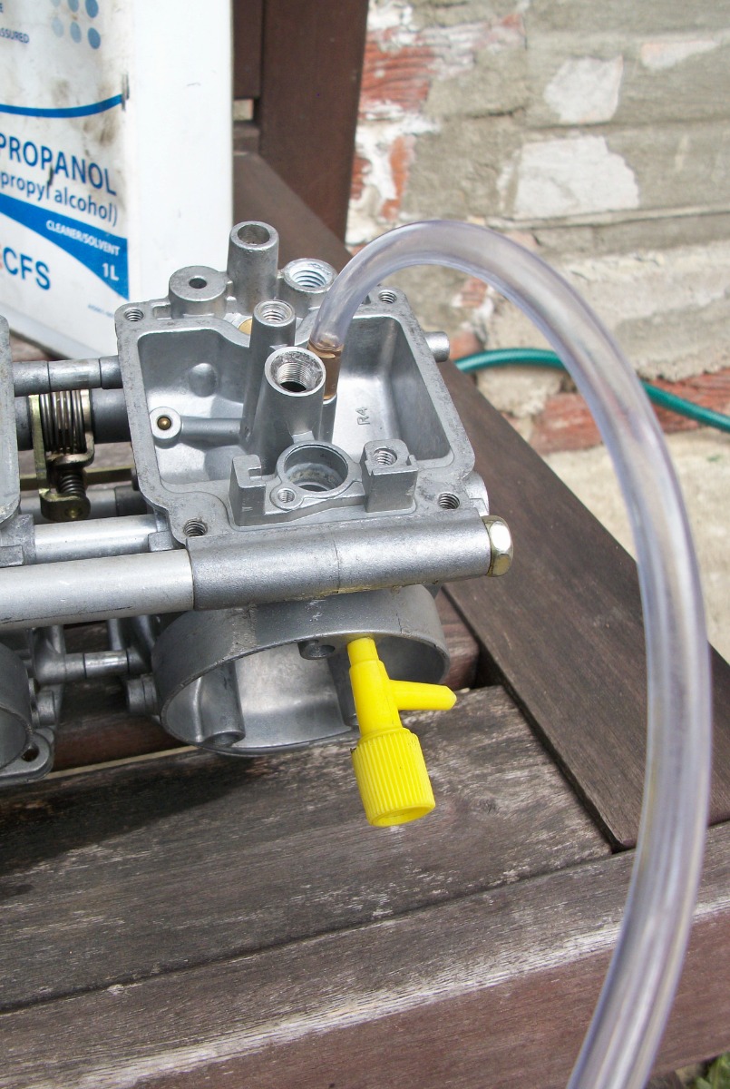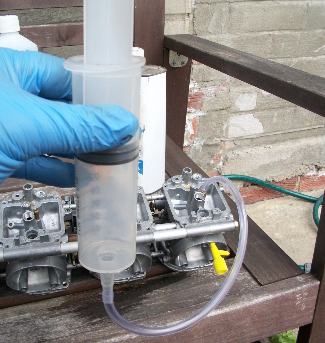 After removing the jets etc (placed in an egg box labelled 1-4) I got out my large syringe from the brake bleeding box and rigged up a high pressure jet wash with the aid of tubing and suitable plugs.