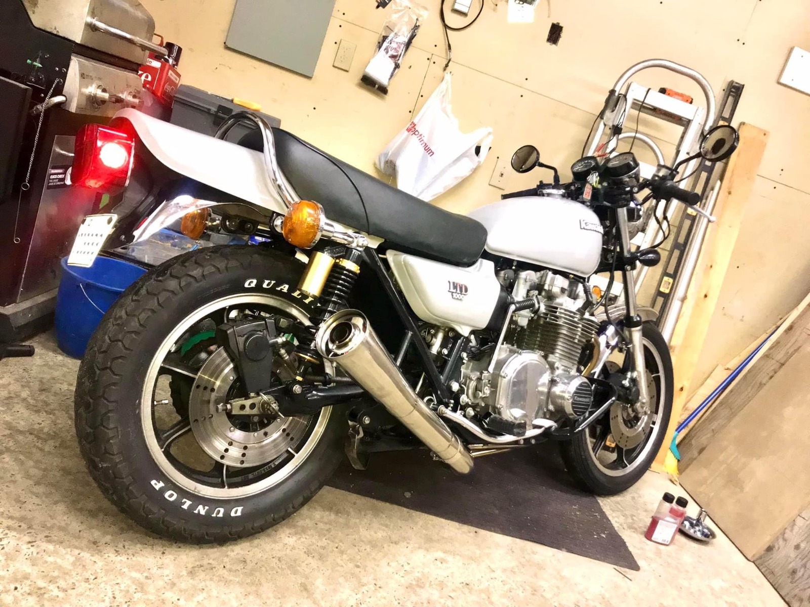 1978 KZ650 C2, 130K kms, Delkevic ex, EI, CVK32, PMC easy clutch, ATK fork brace, steering damper, braced swingarm, ZRX shocks, 18" Z1R front wheel.