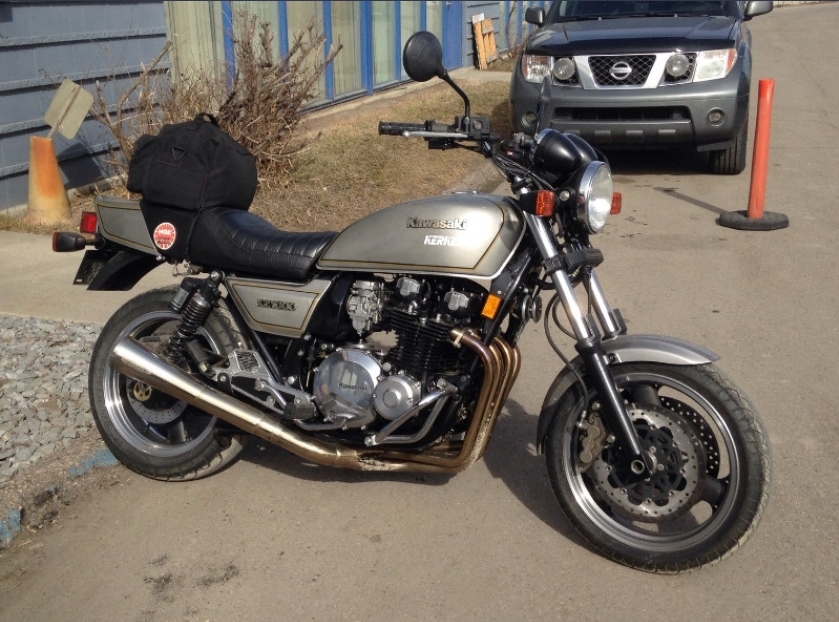 1978 KZ650 C2, 130K kms, Delkevic ex, EI, CVK32, PMC easy clutch, ATK fork brace, steering damper, braced swingarm, ZRX shocks, 18" Z1R front wheel.