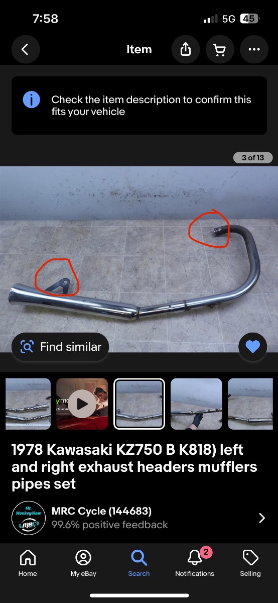I have no idea what forum this question fits into so I apologize if it’s the wrong one. I’m 19 and I just recently bought a used 1979 Kawasaki KZ750 Twin and I am fixing it up and making it run again. I took the exhaust off of my bike and the H-pipe that connected the two exhausts on each side broke off as I took the exhaust off to clean it, so I need a new exhaust. I don’t really want to drop $400 on a brand new exhaust because the mufflers are still in good shape and I really only need the headers. I saw an eBay posting for the exhaust from the same bike I have but it’s a different manufacturing year, 1978. Would the two exhaust measurements be the same and would it work? The mufflers have a pin thing that screws onto the rear foot peg to prevent it from bouncing around when you’re riding. Would those measurements be the same and would it line up? It would be a good way to save money. And if not, where could I get just the headers or even a cheaper exhaust than $400? I attached two pictures, one of my bike, and one of the eBay listing I saw with the red circles marking the two things that would need to line up in order for it to be compatible.
