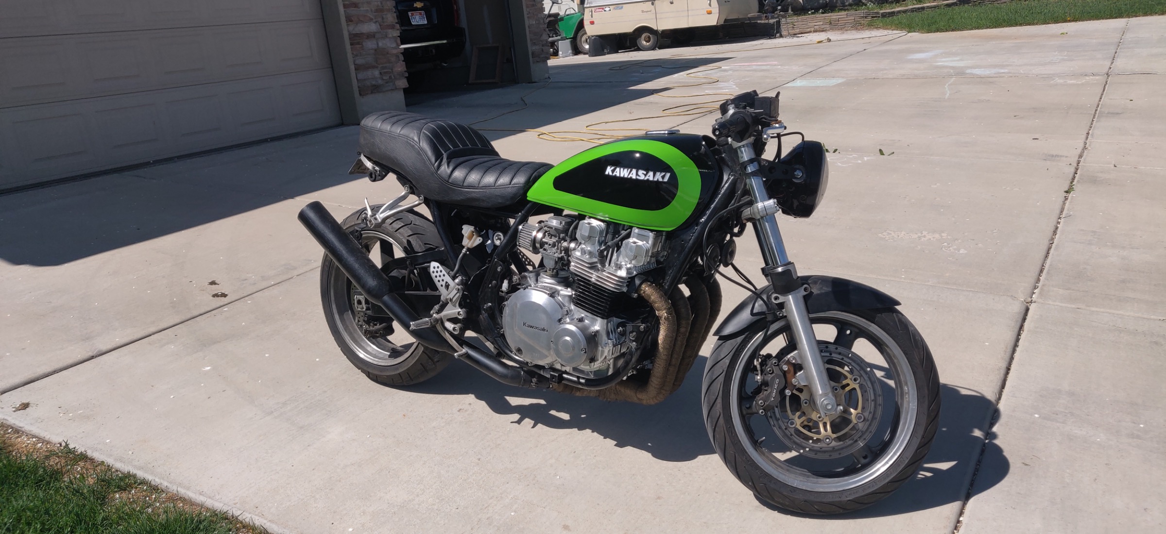 1978 KZ650 C2, 130K kms, Delkevic ex, EI, CVK32, PMC easy clutch, ATK fork brace, steering damper, braced swingarm, ZRX shocks, 18" Z1R front wheel.