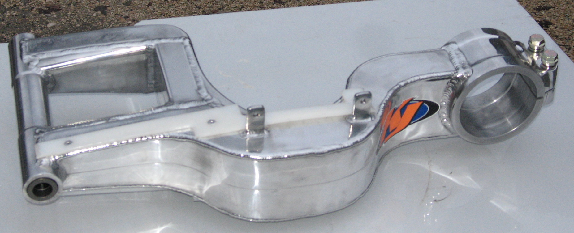 When that didn't work out I I got a 98 KZP swing arm that is 1 1/2" longer and is beefier than stock. Problem was it's wider at the pivot so I had to shave some off each side, cut the spacer to match, install thick washers over the inside pivot bushings for it to clear then clamp down in the inside of the frame. I didn't want to shave the bushings in case I wanted to go back to stock if this didn't work. It works well with no slop and is solid but it presented another problem. THE TIRE HITS THE FENDER ON LARGE BUMPS! I made a fender extender to move it 2" back so that worked.