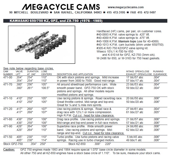 " only the exhaust cam on the 83-86 Unitrac zx750's have a smaller base circle. The intake cam has a "normal" base circle exactly the same as any other kz750 or kz650 intake or exhaust camshaft."