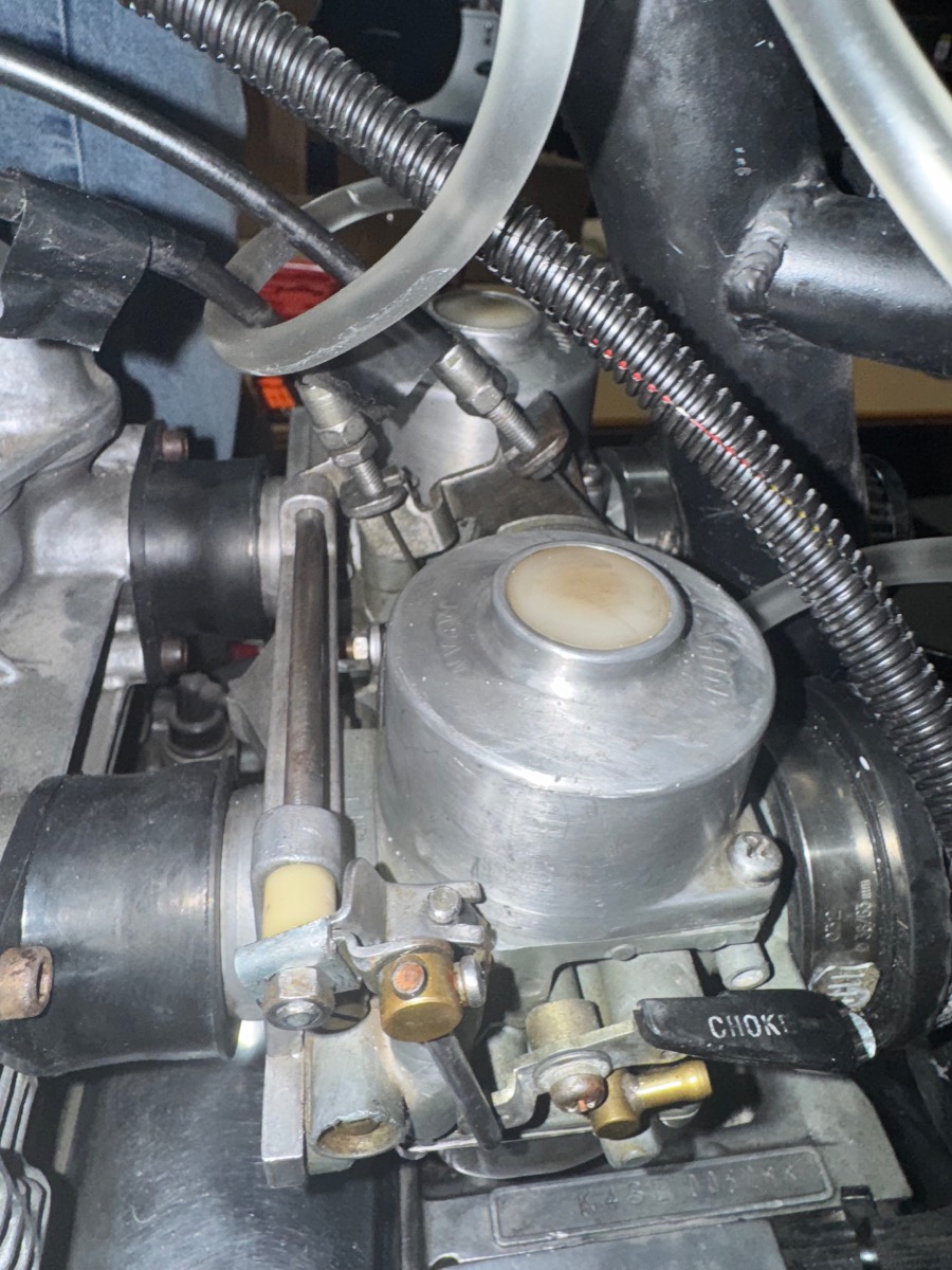 Outcome: we got it to start. I may have had to spray starter fluid in the carb bodies the first few times (don’t judge us) to get her going. But after a few cycles of that, she’d start with just a kick. But SHEESH is it rough (as expected) and is bogging badly with throttle.