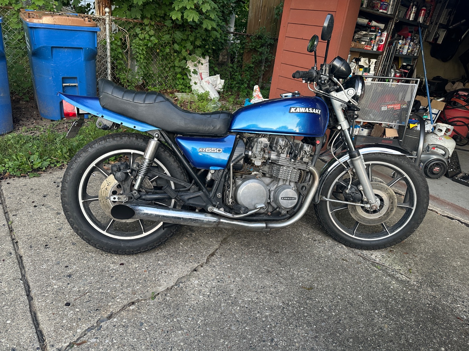 1978 KZ650 C2, 130K kms, Delkevic ex, EI, CVK32, PMC easy clutch, ATK fork brace, steering damper, braced swingarm, ZRX shocks, 18" Z1R front wheel.