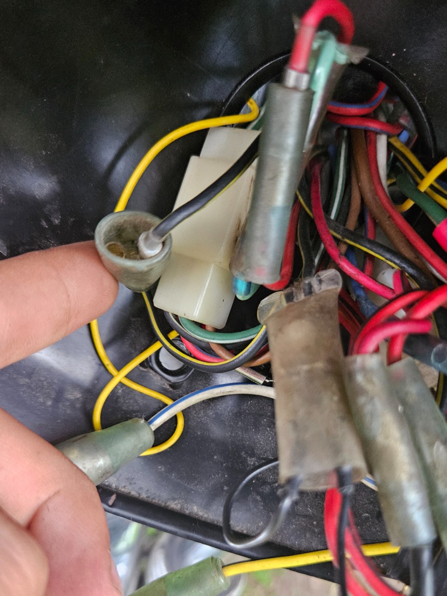 Currently my problem is that the last owner was not very kind to this beast and messed it up a lot. My turn signals don't blink when I activate them so went looking into the wiring and found a connector in the headlight area that is supposed to have a ground wire attached to it, but it is broken off.