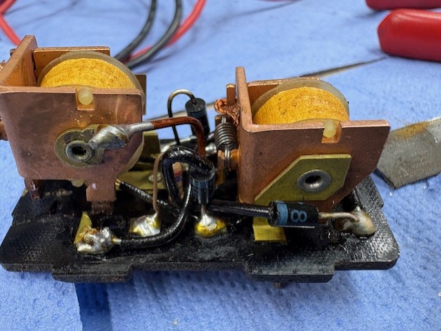 And some photos if they help! I rebuild these John Deere breadboards all the time and..they have the identical dual 12V relays built into each package as the schematic Wookie displayed. They are NEC or NEXEM EP2-3N1ST. About 5bucks a piece. Only difference is You'll have to solder on the diodes and singular resistor once you know it's value. Note the 1/4watt resister with the tolerance band of Gold, that's a 5% one, yours will be similar. Probably if you're clever, reuse the old can and solder accordingly. No One would even know, ha.