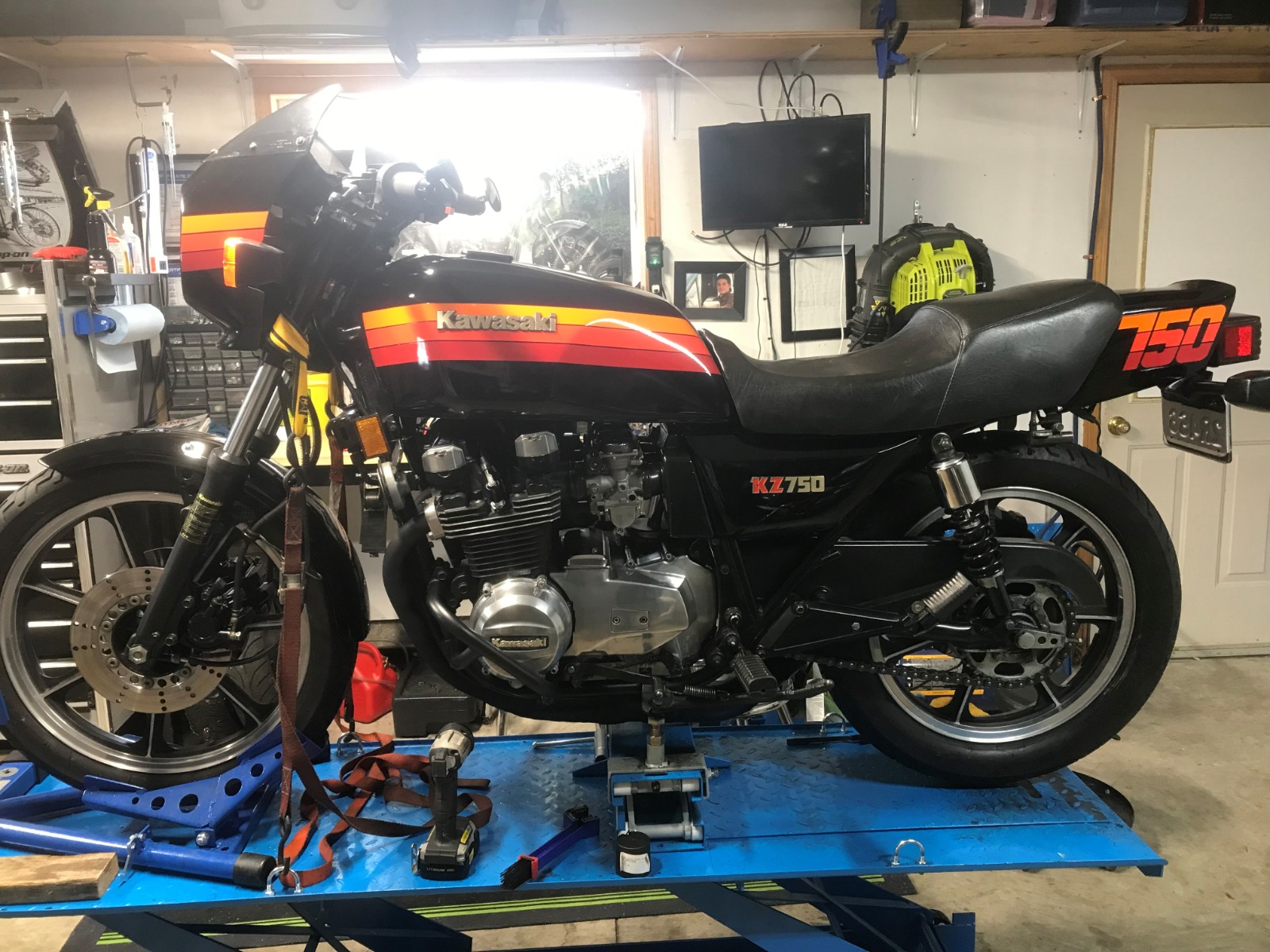 1978 KZ650 C2, 130K kms, Delkevic ex, EI, CVK32, PMC easy clutch, ATK fork brace, steering damper, braced swingarm, ZRX shocks, 18" Z1R front wheel.