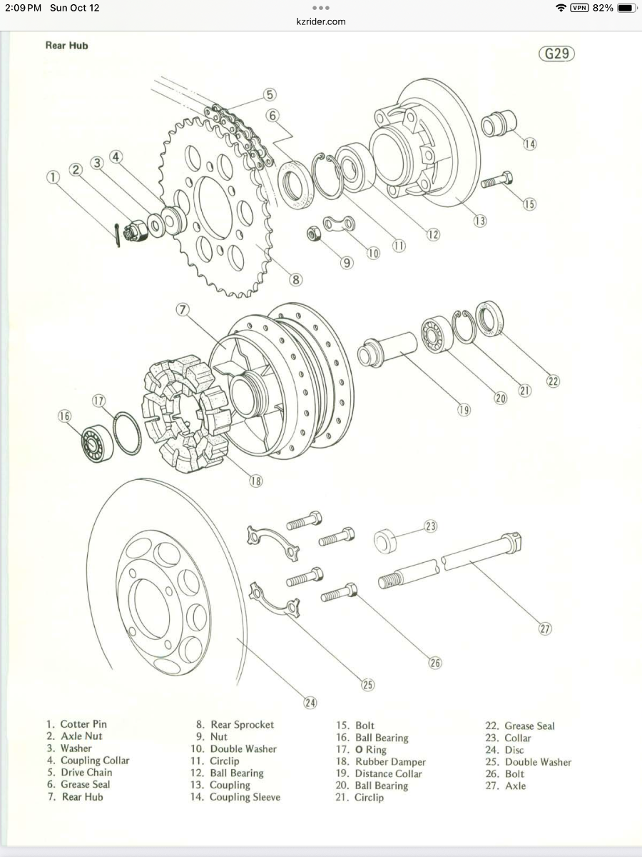 Recently replaced rear wheel bearings and now my sprocket hub coupling sleeve won't seat on the bearing, it hits before the hub will seat in the damper. Ive had three guys look at it with KZ knowledge and their at a loss. Also the sleeve is flat side on bearing, bevel is not touching anything.