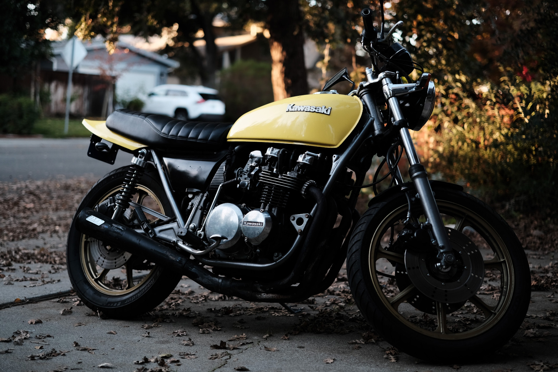 1978 KZ650 C2, 130K kms, Delkevic ex, EI, CVK32, PMC easy clutch, ATK fork brace, steering damper, braced swingarm, ZRX shocks, 18" Z1R front wheel.