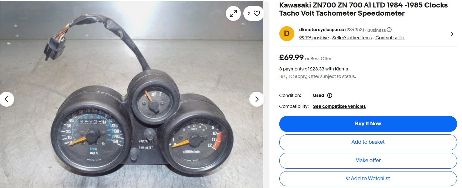 Today 02:04 - Today 02:05Clocks look right to me ?I could be wrong, as I'm not an expert on that exact motorcycle, but for sure the paint has be redone, and I don't believe the guages are even remotely close to original to the 700cc model, so there is no telling what the miles may be in truth. A KZ650/700/750 at 40,000 miles will have multiple oil leaks if not repaired from the multiple orings used everywhere. If repaired they will return after some time. I don't mean to criticize, just saying my opinion and experience. The cam chain is not a big problem, but the idler roller sprockets have rubber centers that go away to dust and the tensioner is not the best. I assume it has the single row chain like a KZ650.