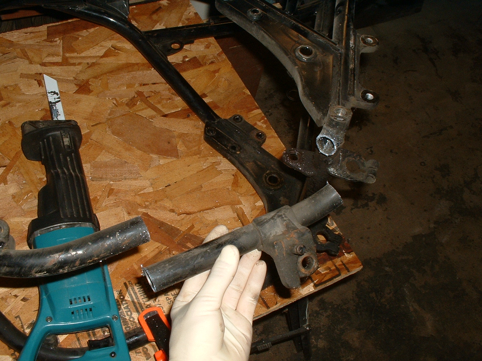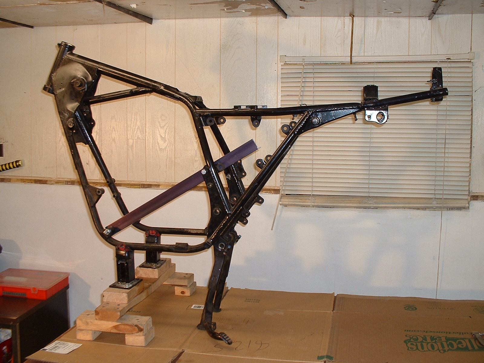 As you can see in the photo, I shaved all of the tabs (some were mangled anyway). You can also see how the subframe was hack-welded on. It's a crappy mig job. I don't know who welded it. Bottom line is, the sub-frame is all out of whack. I used some pipe clamps and 2X4's to get it straightened. Most of the critical areas (swingarm to steering axis) are now straight. It's going to take some trickery to get the tail and subframe to "look" straight. The shock mounts are a little off, but there's no fixing that without major work. I'll see if it affects the handling before I undertake that job.