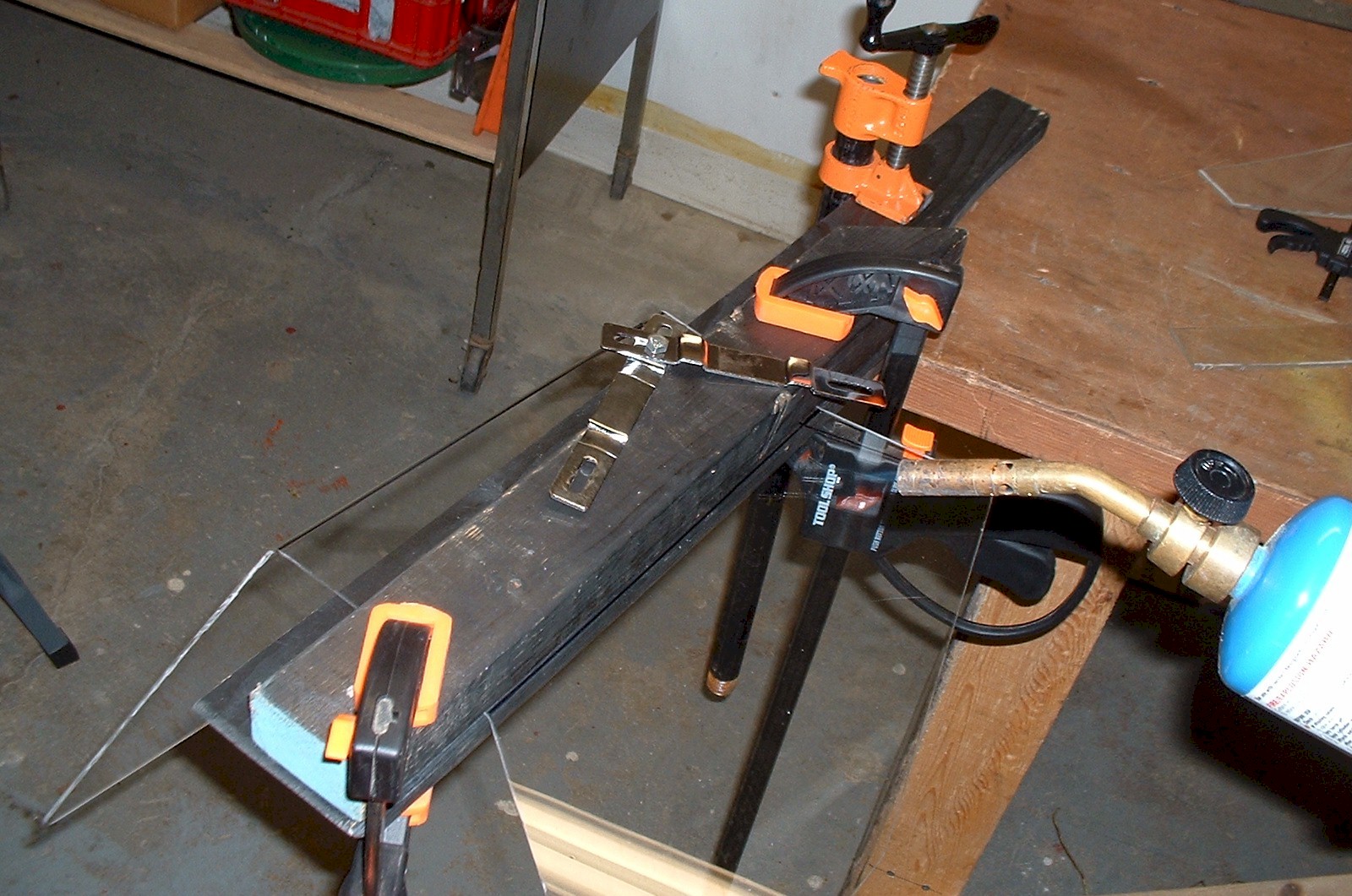 To bend acrylic, I just used a propane torch since I didn't have a heat gun. It works ok, but you really have to heat it slowly . I clamped it between two pieces of wood. I made a mistake in this photo. The upper piece of wood should be set back about 1/4" to 3/8" so the plastic will heat slightly before the bend. On this trial, the bend happened away from the wood form. I routered the lower wooden form to a 1/4" radius to make a nice smooth bend.