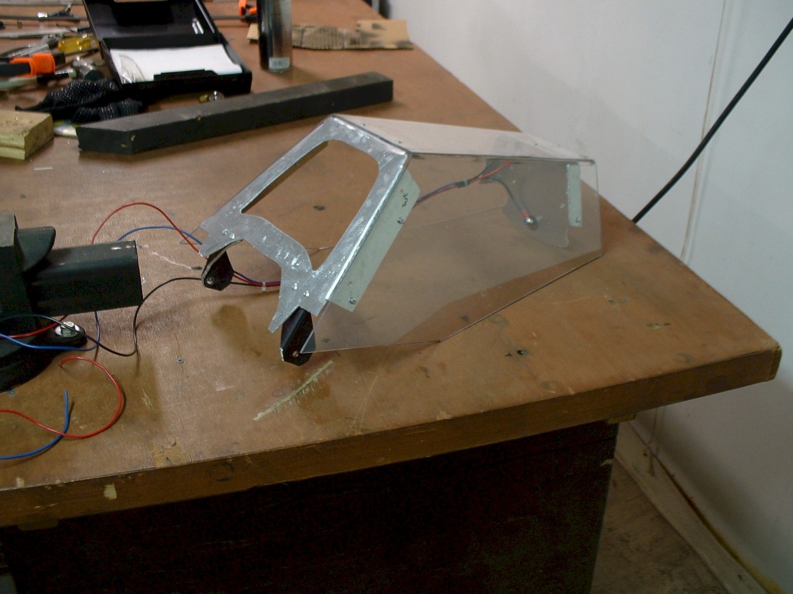 The final piece should be polycarbonate and it works slightly differently. To cut it, a utility knife works best. Score it about half way through (it's easier than acrylic because it's softer), then snap it carefully. To bend it absolutely requires a heat gun at about 1000 degree setting. (Propane is up around 3000 deg... way too hot.) Polycarbonate drills much easier too. You don't have to go as slow as with acrylic, just don't go too fast or it will overheat and get gooey.