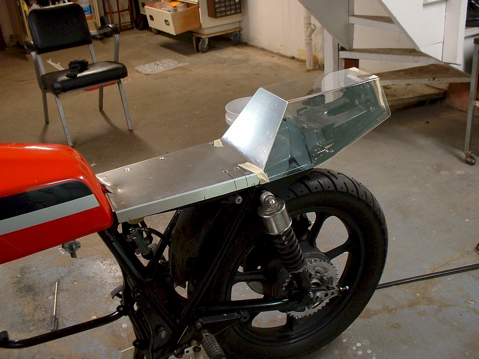 Next was the seat pan. It's 1/8" aluminum bent by hand on wooden forms. The rear bend was done without anything special, but the side edges were tougher. The trick on the side bends is on the underside. Before I bent it, I took a 1/4" thick grinding wheel and cut a groove along the bend line on the underside. I cut about 1/32" deep. This forced the bend to be straight, and it also controlled the bend nicely so there are actually 2 bends right next to each other if you look very carefully in person. This gave a very nice machine-bent look to it.