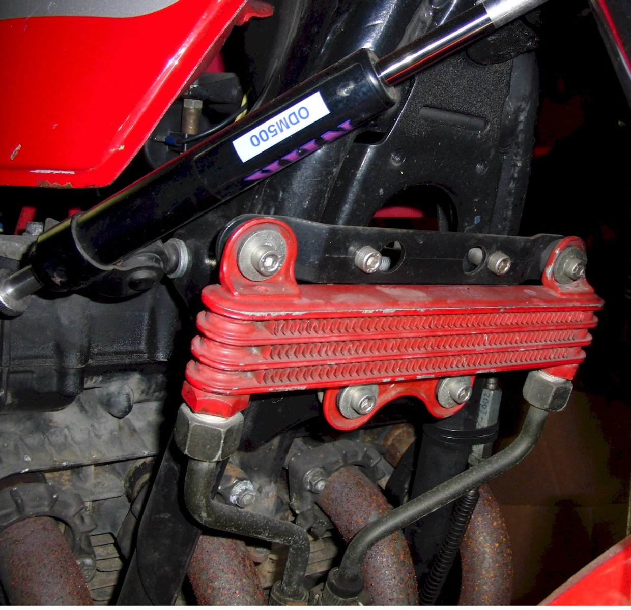 The main problem with a steering damper on the Kz550D1 and H1 gpz is the oil cooler is right in the place where the steering damper needs to go. So I cut the lines and lowered the cooler a couple inches... maybe less. I just clamped the hoses back onto the cooler lines after cutting them down. I put two clamps on each line (not shown).