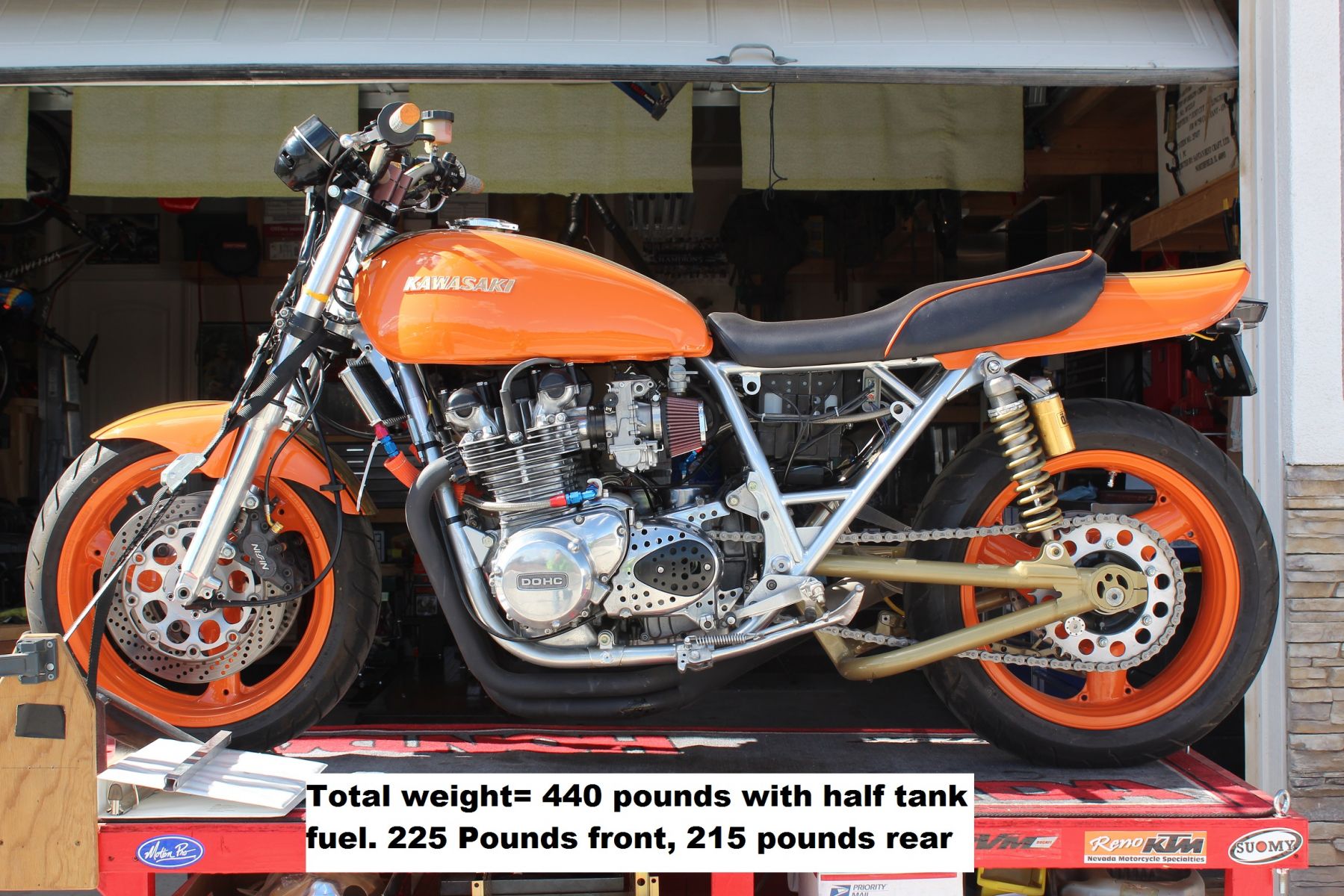 I leveled the bike and set it on a scale, firs the front, then the rear. Weighs in at 440 pounds with half tank fuel. A little heavier than I was shooting for. Wanted to hold it at 425 dry. 2.2 gallons of fuel weigh about 13.75 pounds, which would give it a dry weight of 426.5 pounds. Not bad.
