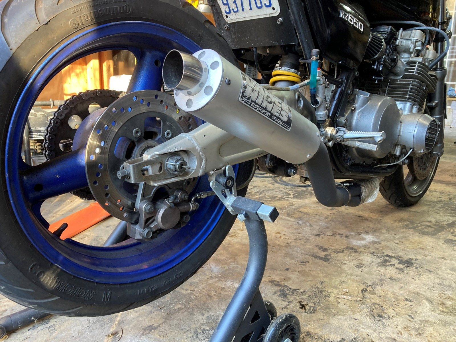 Well as expected the longer swingarm made the bike not want to turn at all. I converted back to the stock length swingarm. Also dug into the carbs to see if I could remedy the part throttle cruising issue I faced on the way home from work. I thought the pilots were going to be stock 37.5 Mikunis and they were just too lean at that throttle setting... nope, someone had 45s in there and I was seeing the result of a fat pilot instead. I wonder if the larger ones were used on larger displacement (GPz1100) motors? Anyway, I had already ordered the 40 pilot jets that I have seen suggested to be paired with the DJ stage three that I have been running for years, I just need the time for a test ride soon...