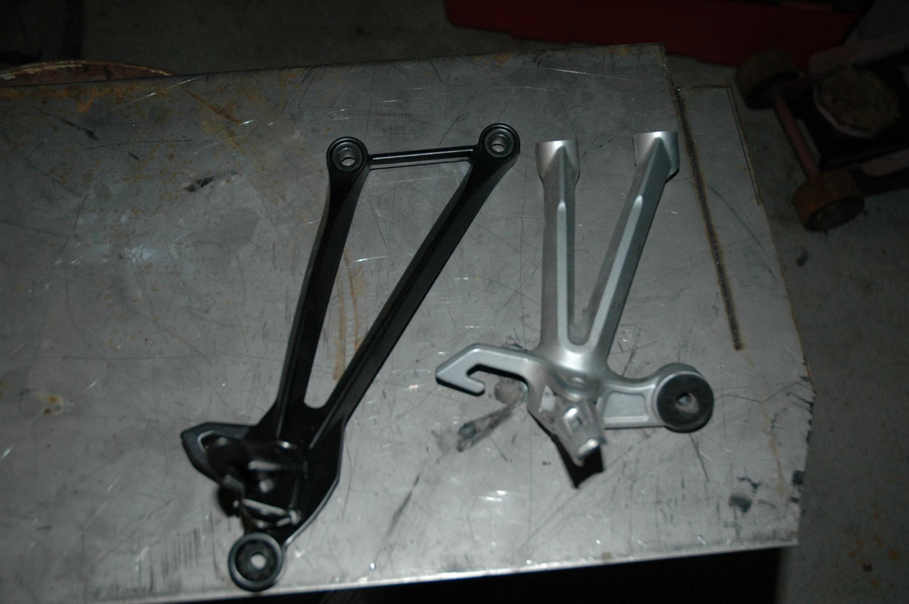 OK, The mail man brought the new passenger pegs, from an 08 GSXR 1K. They are shorter than the ZX10 passenger pegs regrettably, but the GSXR's under mount will serve the project better than the side mount style of the ZX parts. I'm sorry dear wife, your beautiful long legs will be a little more cramped, but its for the good of the project!