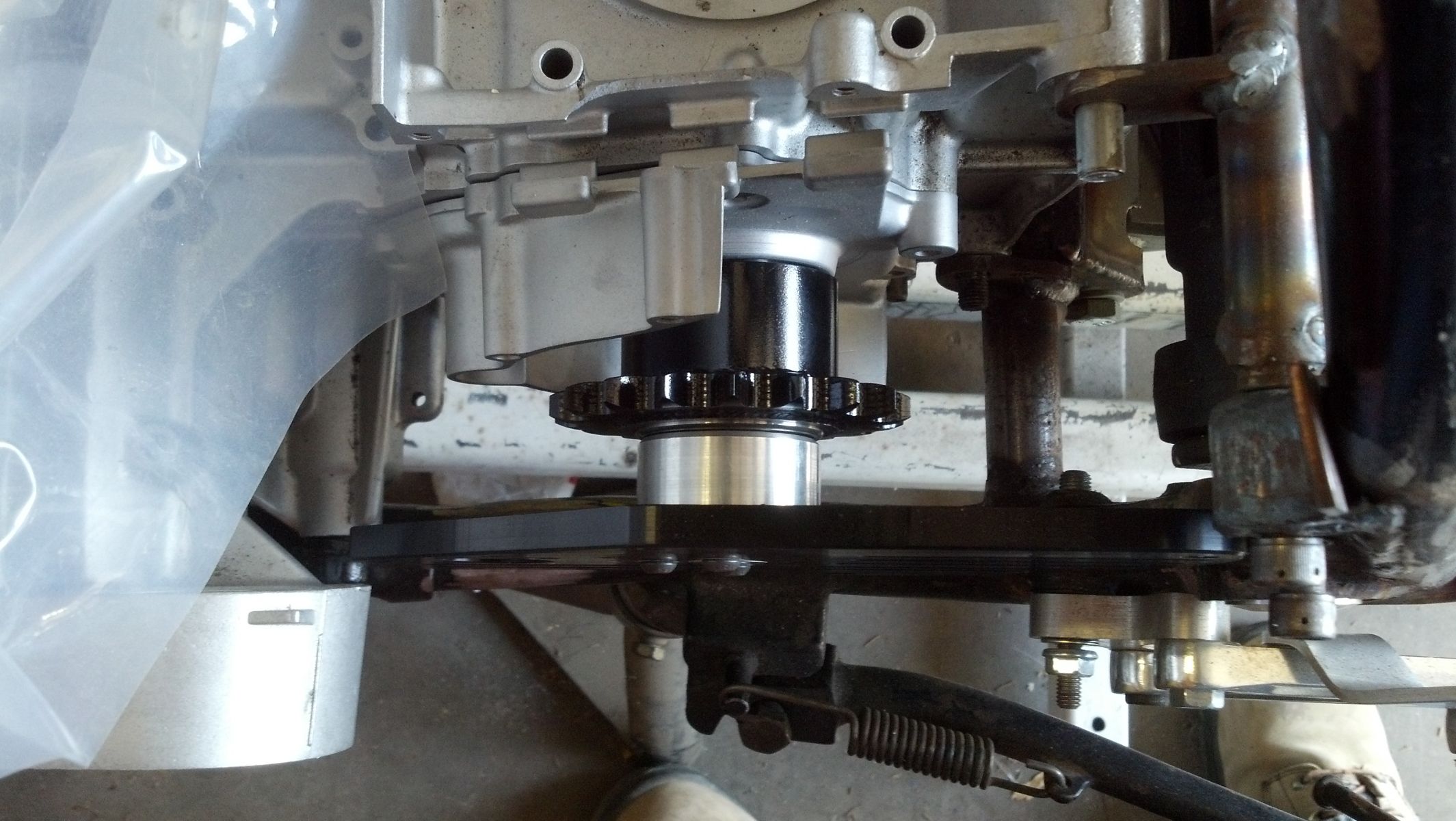 Interestingly enough, the new D&G sprocket mounts the bearing support plate a tiny bit closer to the engine than the PMFR part. I know Doug was trying to keep it close to aid in making the clutch parts work, and keep it close he did. Sitting on the output shaft with the bearing support spud in: