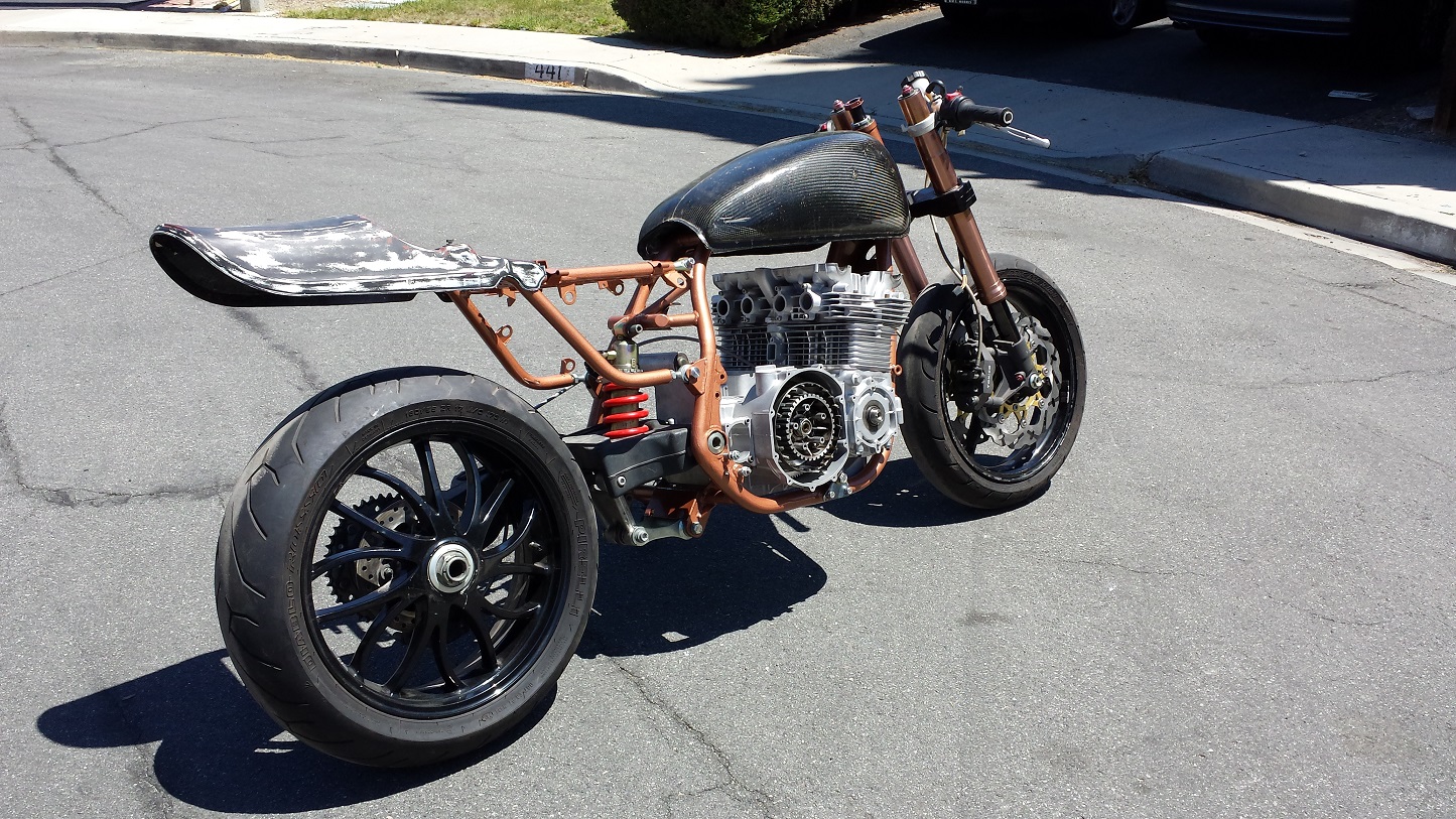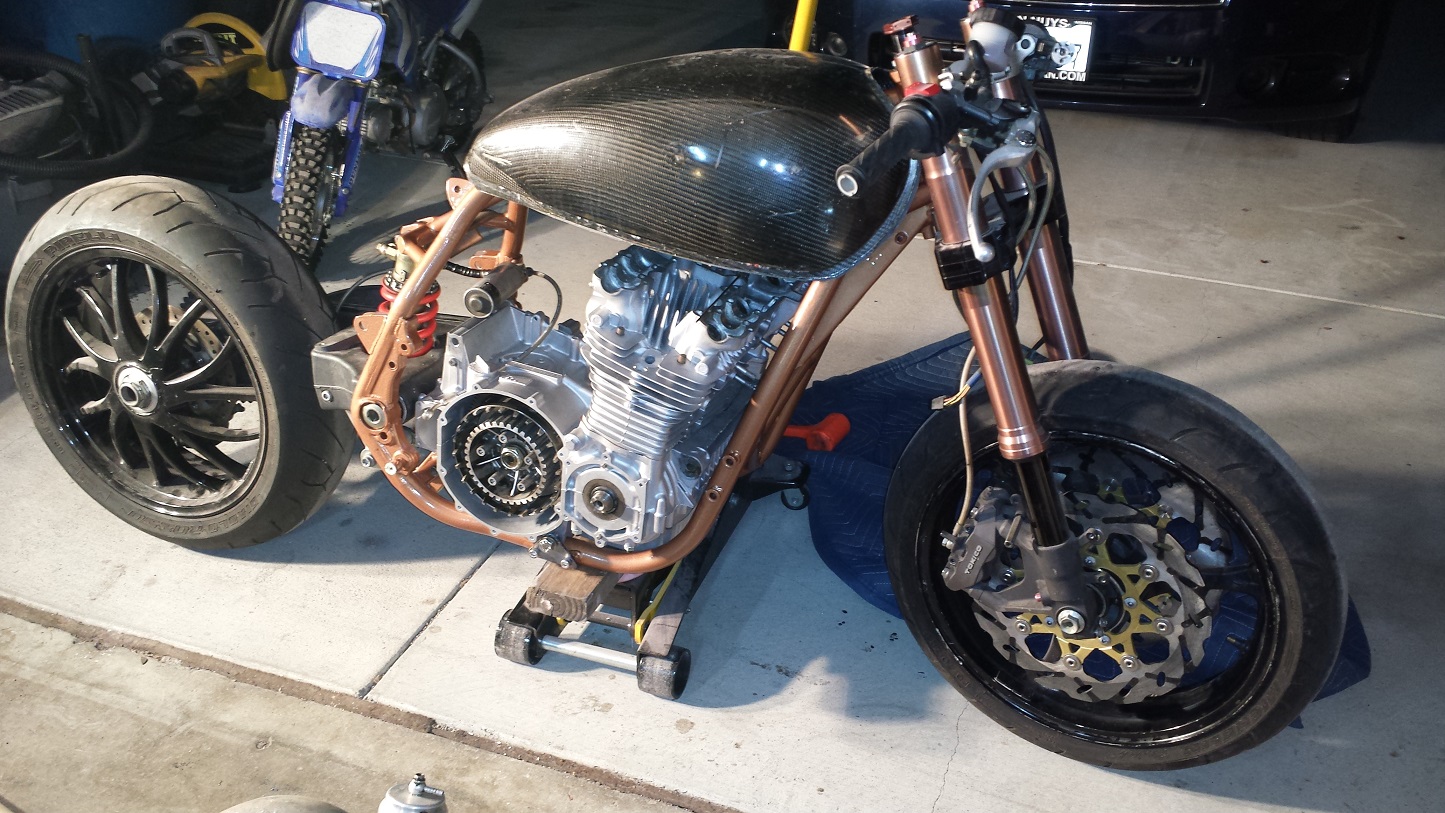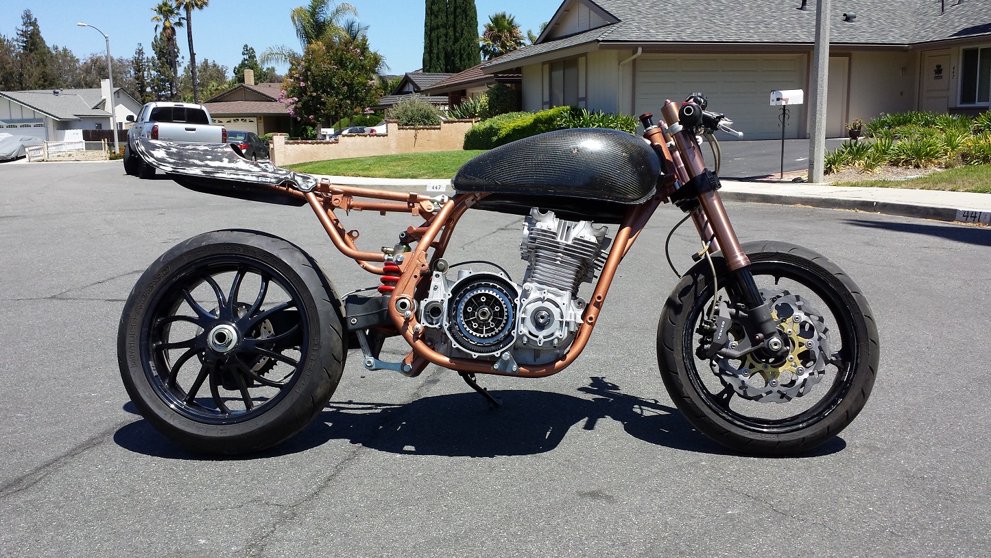 Very nice ,at first i thought the copper was a little odd. With it assembled it realy looks great. blends with the forks well also looks bad ass with the swing arm (nice work) , whats the size of the engine?