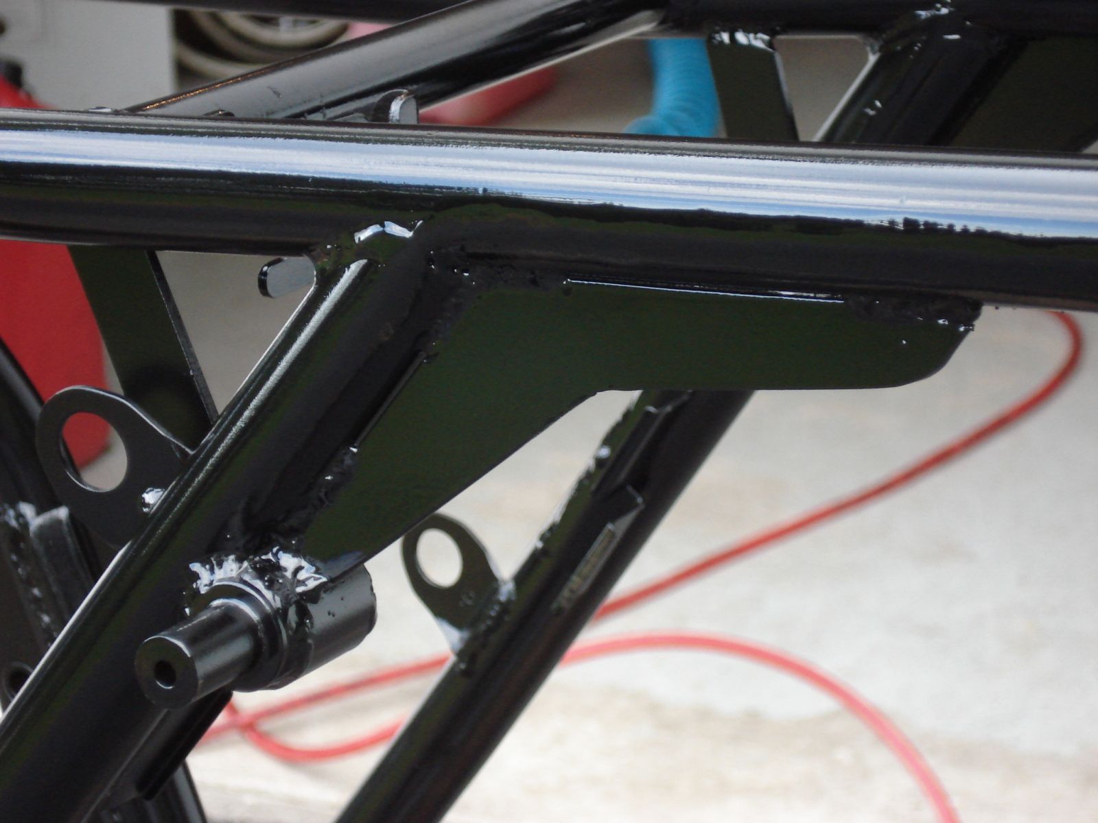 Version 2.0 on the shock mounts, I modded another frame. This time I did it a bit differently. It looks pretty similar, but I recessed the shock lugs 1/3 of the way into the frame tube, and I used one thin gusset, instead of two thick plates. The other two pics are stock, and the first set that I moved.