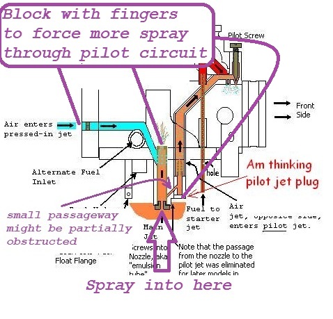 22 Sep 2011 12:17 - 22 Sep 2011 12:18With pilot jet plug removed, and squirting carb cleaner into the pilot jet, spray should exit from both small ports in top of carb bore toward the engine side.