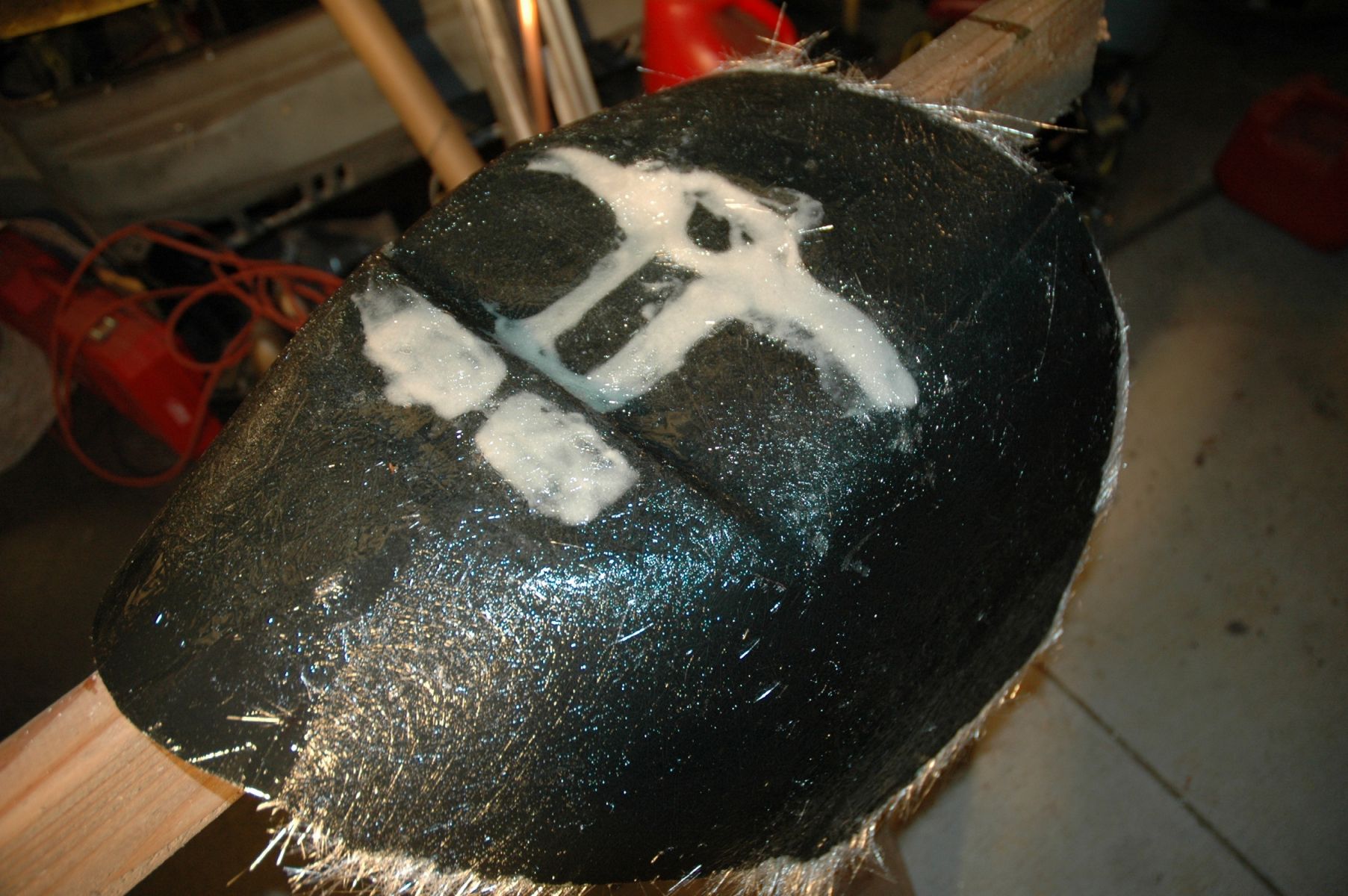 Here I have placed a layer or two of chopped strand mat around the perimeter of the flange, letting the initil coat of resin tack up a little more. Throughout the afternoon/evening I continued adding additional layers of chopped strand mat over the entire surface. Tomorrow I will release it and as long as it looks good, I'll start making the necessary modifications to the master plug. Once that is complete, I can make the master mold from the master plug and laminate a primary part...Doesn't sound like too much, does it?