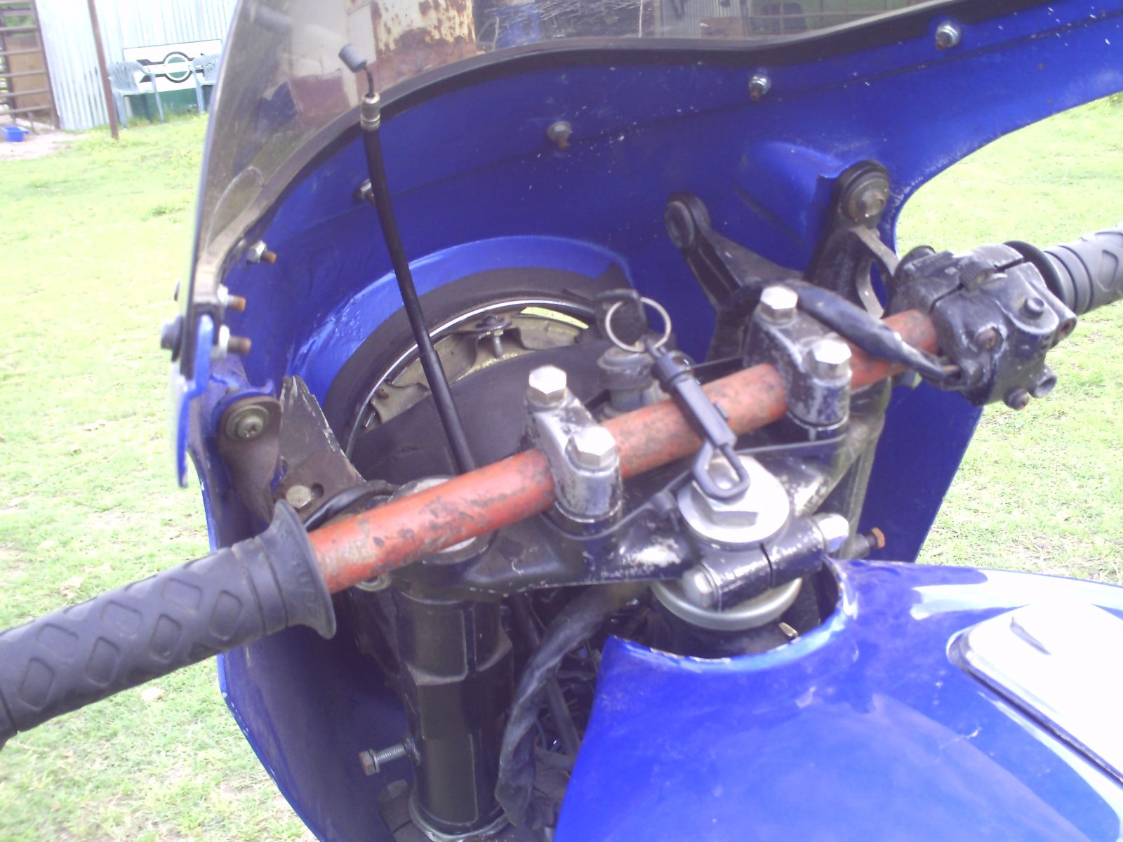 it is using a horseshoe stake for handlebars,it is missing all the z1r unobtanium from the front end and brake system.the perches and levers are gone,the front brake m/c and res. are missing as well as the front calipers.the dash and guages are gone,both fairing brackets are broken and some of the left one is missing in action.the right handlebar switch has been bastardized with some other switch mounted in the housing.it has a badly repaired fairing and cracked shield.