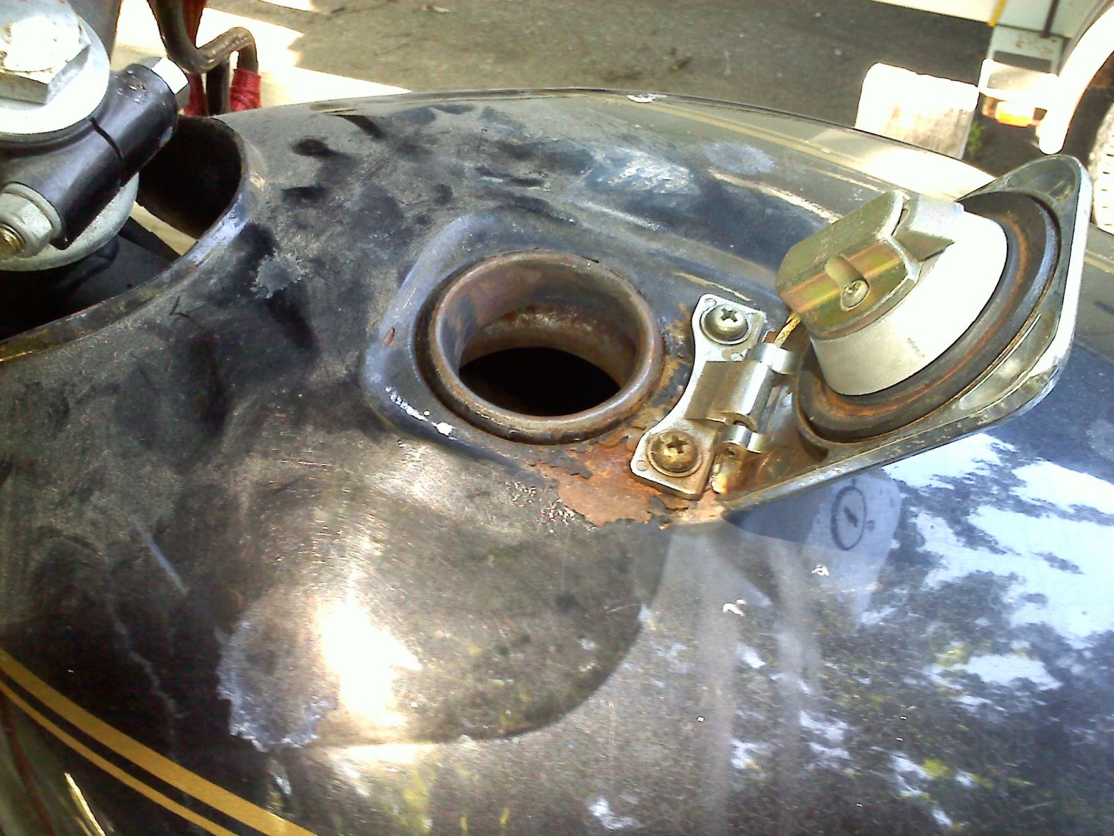 The engine cranks over nicely and I was told it would run on ether. The carbs are frozen solid. The gas tank is clean as a whistle on the inside but has a little rust bubbling under the paint on the LH side along the bottom and a little around the gas cap. I don't really want to repaint it so I'll have to make a final decision on that after the rest of the bike is done.