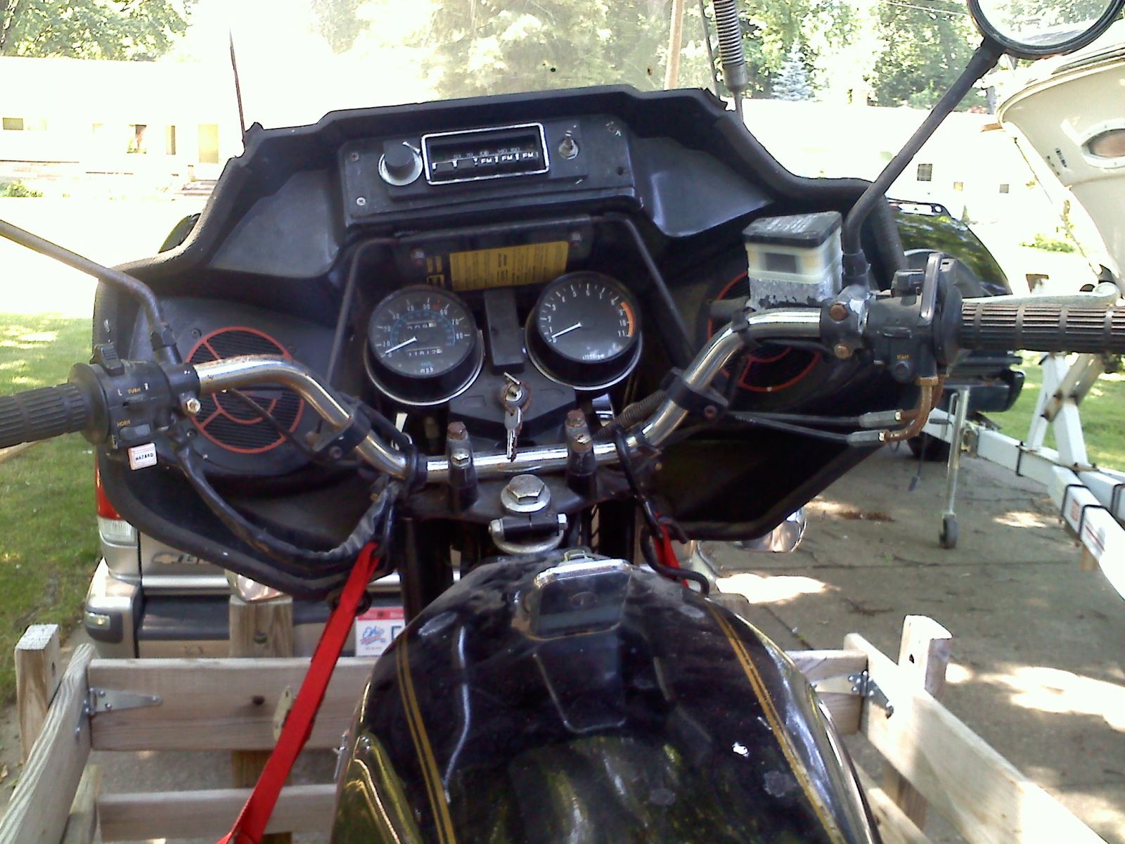 It also came with a Vetter Rooster fairing...complete with am/fm radio! It has Shoei hard bags as well. I'm still undecided about keeping that stuff on. Well, here's some pictures from yesterday: