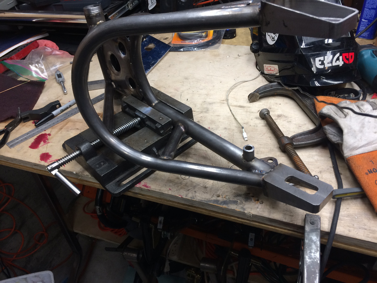Ive been busy. rear end is finished and off to powder. I also designed and had these triples milled. I did the drilling, tapping, and slitting myself which cut the cost of the trees in half. i also changed my mind after i got the trees and decided to chamfer the edges to match the gas cap rather than have fillets. did it all with files which gives them a "soft" look that i quite like. They are brushed to 400 and nearly ready to go off to anodization. you can see my mock-up lower bearing plug on the stem.