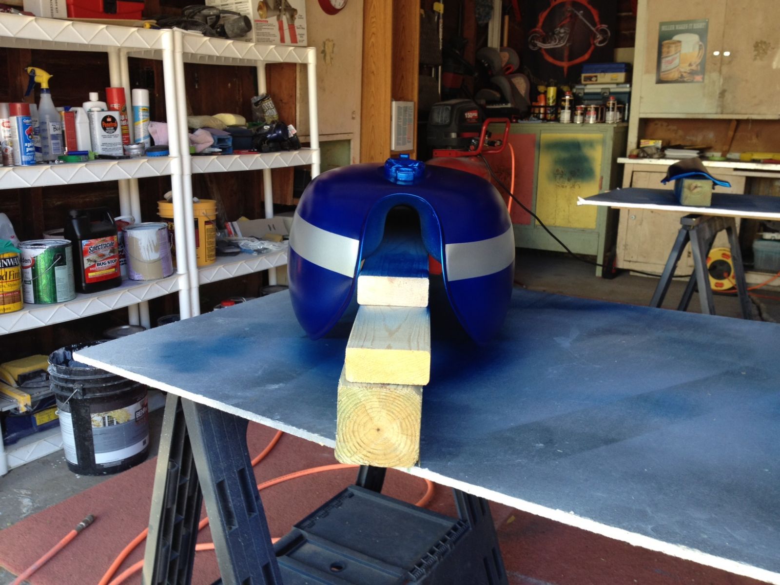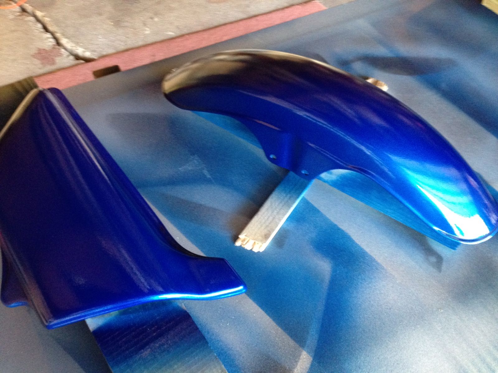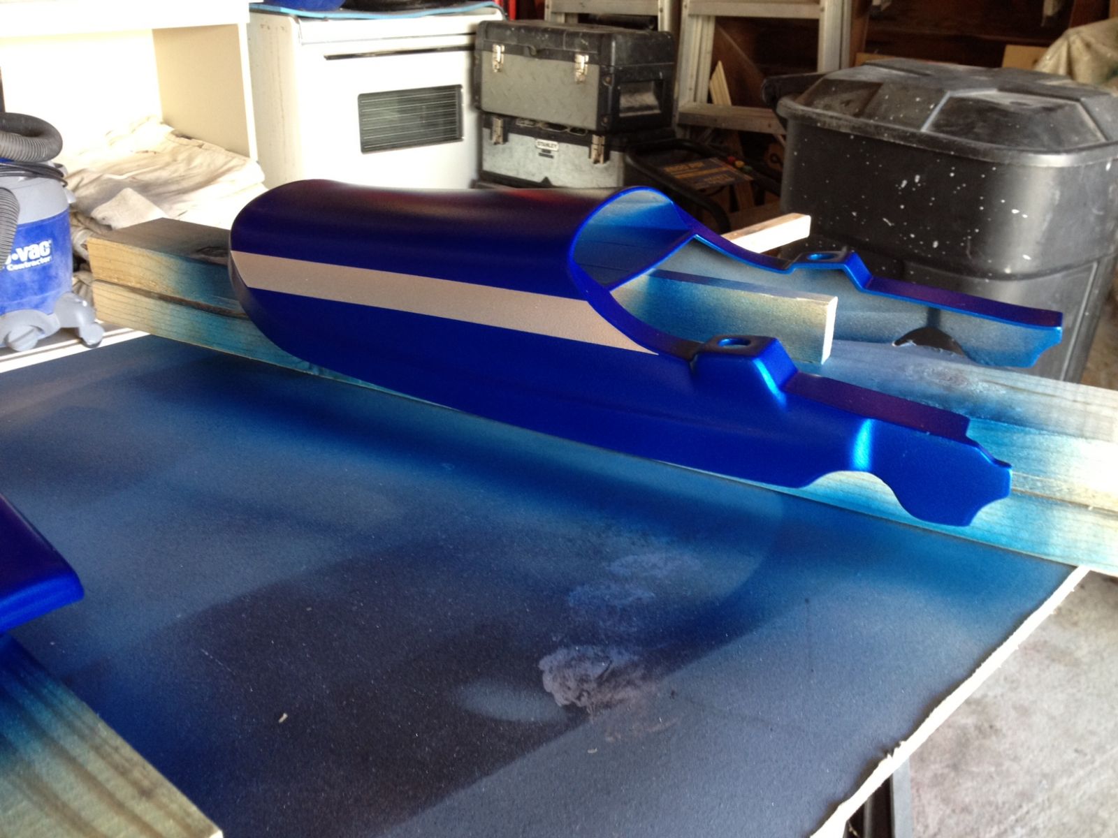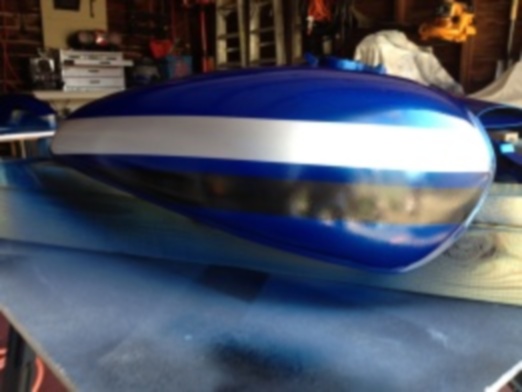 I had a friend that offered to paint my bike for free. Couldn't pass that up. Candy Blue over Silver Metallic with Silver and Black Stripes. Think ZRX style. Getting her painted and it is about done. It's a garage paint job so it probably won't be perfect. Had to sand the clear coat down a bit and re-shoot do to some dust bunnies, e