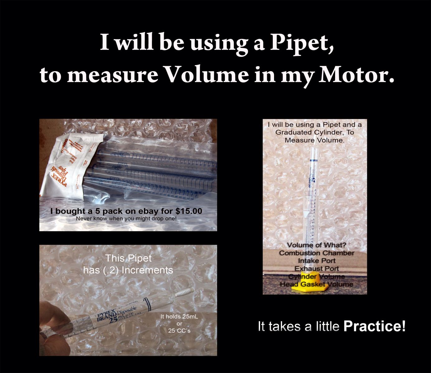 I will use the Pipet to measure the new Compression Ratio and to check the (intake/exhaust) port volume.