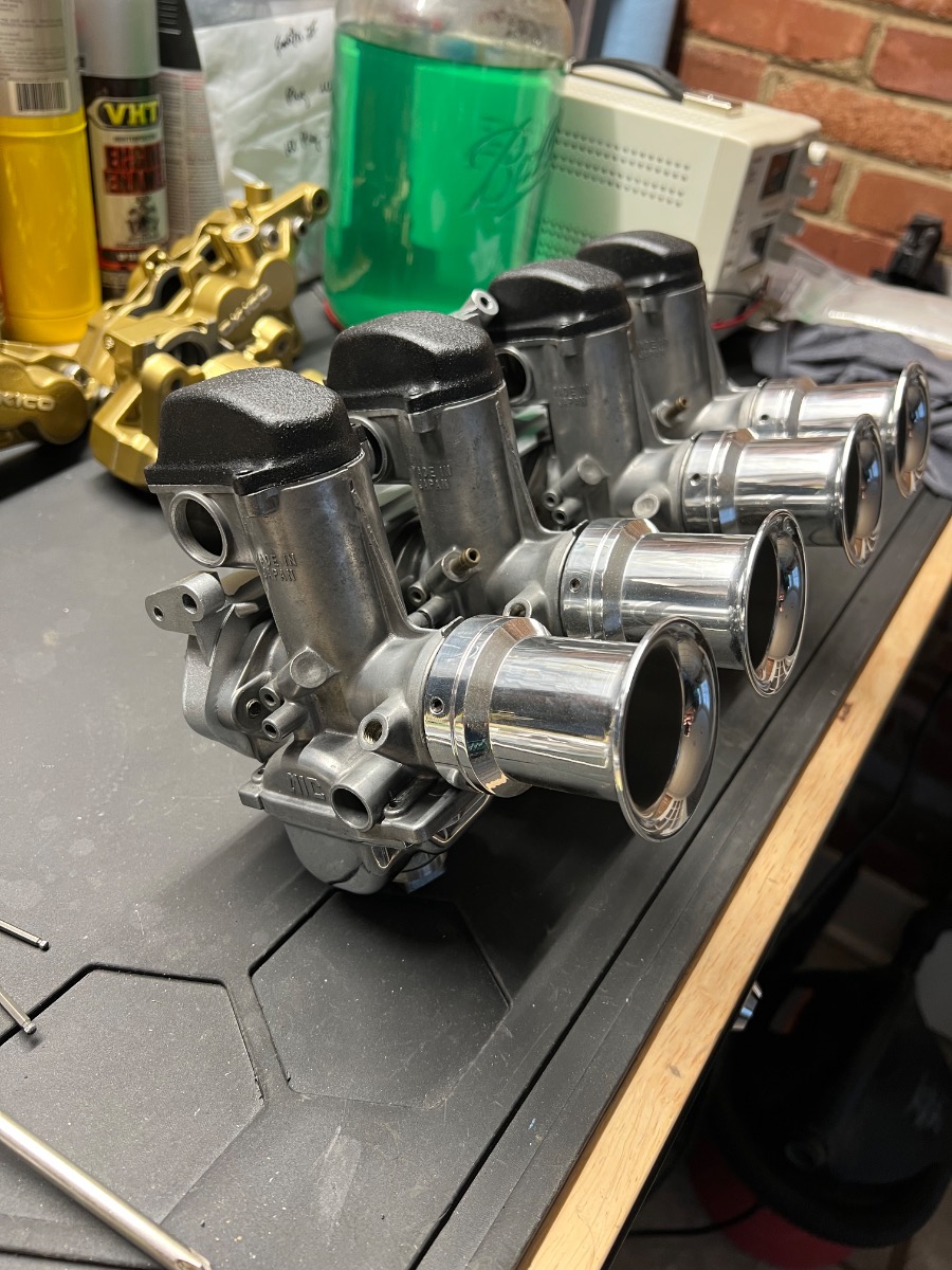 So one set of chrome carb tops were in poor shape, pitted. So I decides to PC them a wrinkle/texture black like the engine covers.