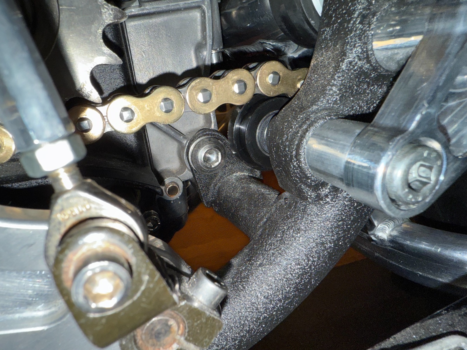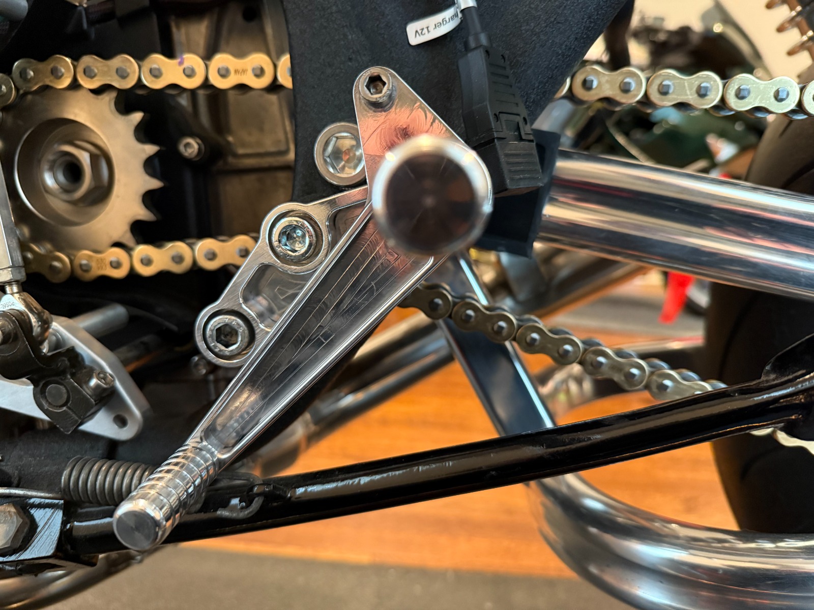 I know other KZ owners have done similar and I know they are used on some extended swingarm bikes. I have never owned one with a roller, so I am conflicted. It is going through the machined footpeg boss that is fully welded and integrated into the downtube, so I am not concerned about strength really, even though it is in single shear.