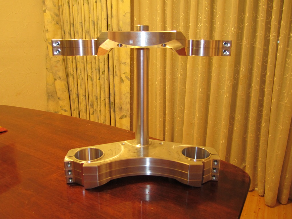 The complete set is different than the top only set up. Ben made the bottom bracket so that the headlight mount bolts to the triple rather than to the fork tubes. He just hadn't made the brackets yet when he shipped those first few sets. I do believe they are intended to be simple flat plate though, so it shouldn't be too much trouble to make something up.