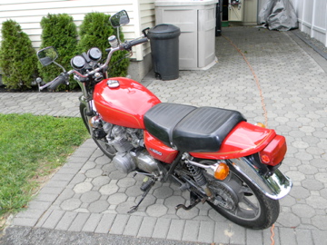 ...the second one cost me $400. I figured it would at least need tires. It's got Metzler's on it that look brand new. I figured it would need a chain. I'll be damned, got what looks like a brand new o-ring chain on it. Battery, right? Wrong, brand new. The seat is sound. It's got new paint on it. Replaced the usual missing odds and ends, except for the air box, I just can't live with an air box. Maybe one day, but not now. Like you said, with a little TLC and a visit from ol' John Barley Corn and it'll be like brand new!