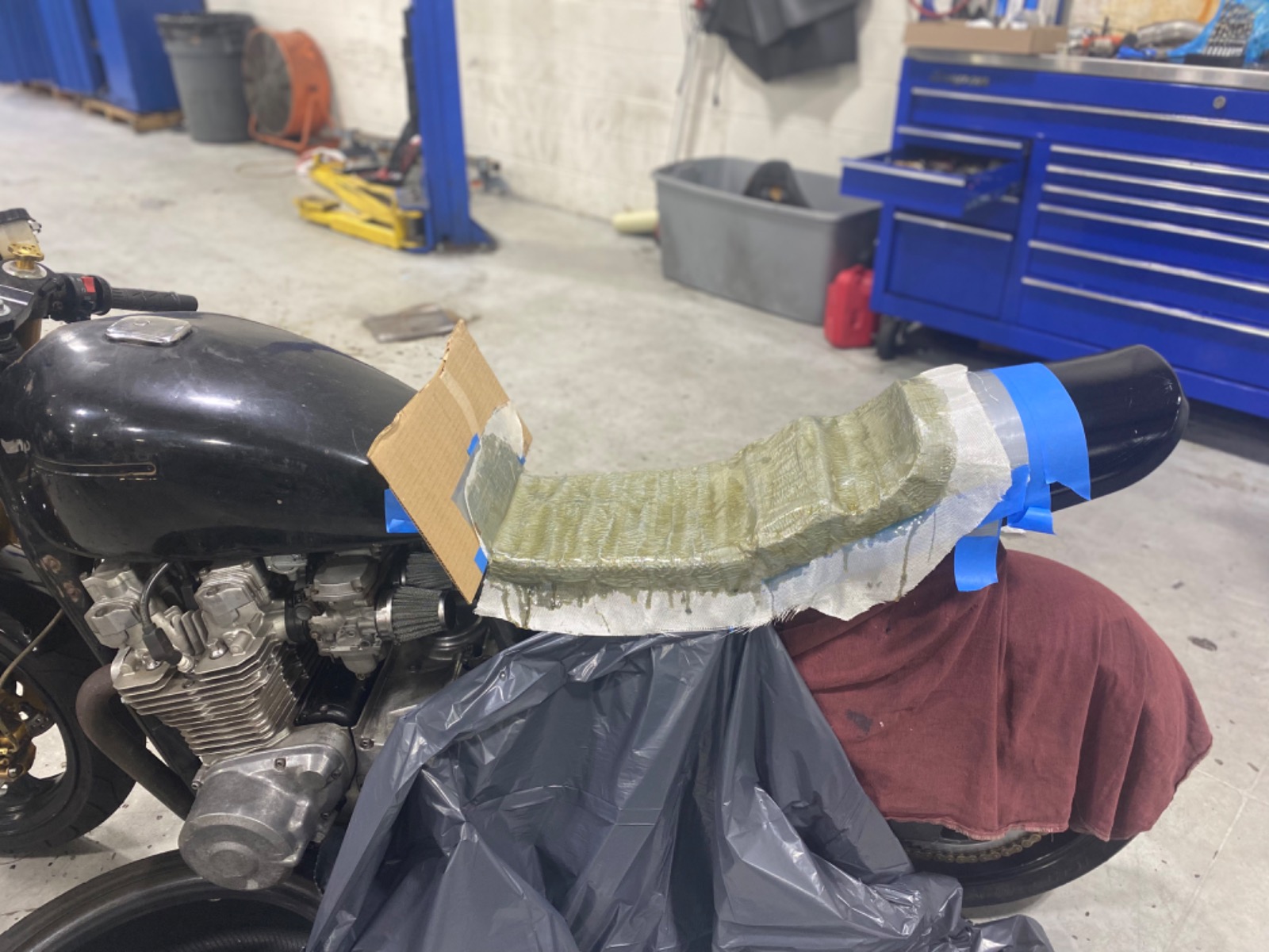 Alright, so I took a swing at the seat pan. Never messed with fiberglass before. I covered the area with duct tape and added some strips of velcro to the edges to simulate the folded over leather. I think it turned out pretty well. Super sturdy. Still need to trim it. Then foam and leather. Waiting on bigger jets and brackets for the rear master cylinder. Last thing is paint. Thinking gloss black with some small gold accents like the AC sanctuary kz1k.