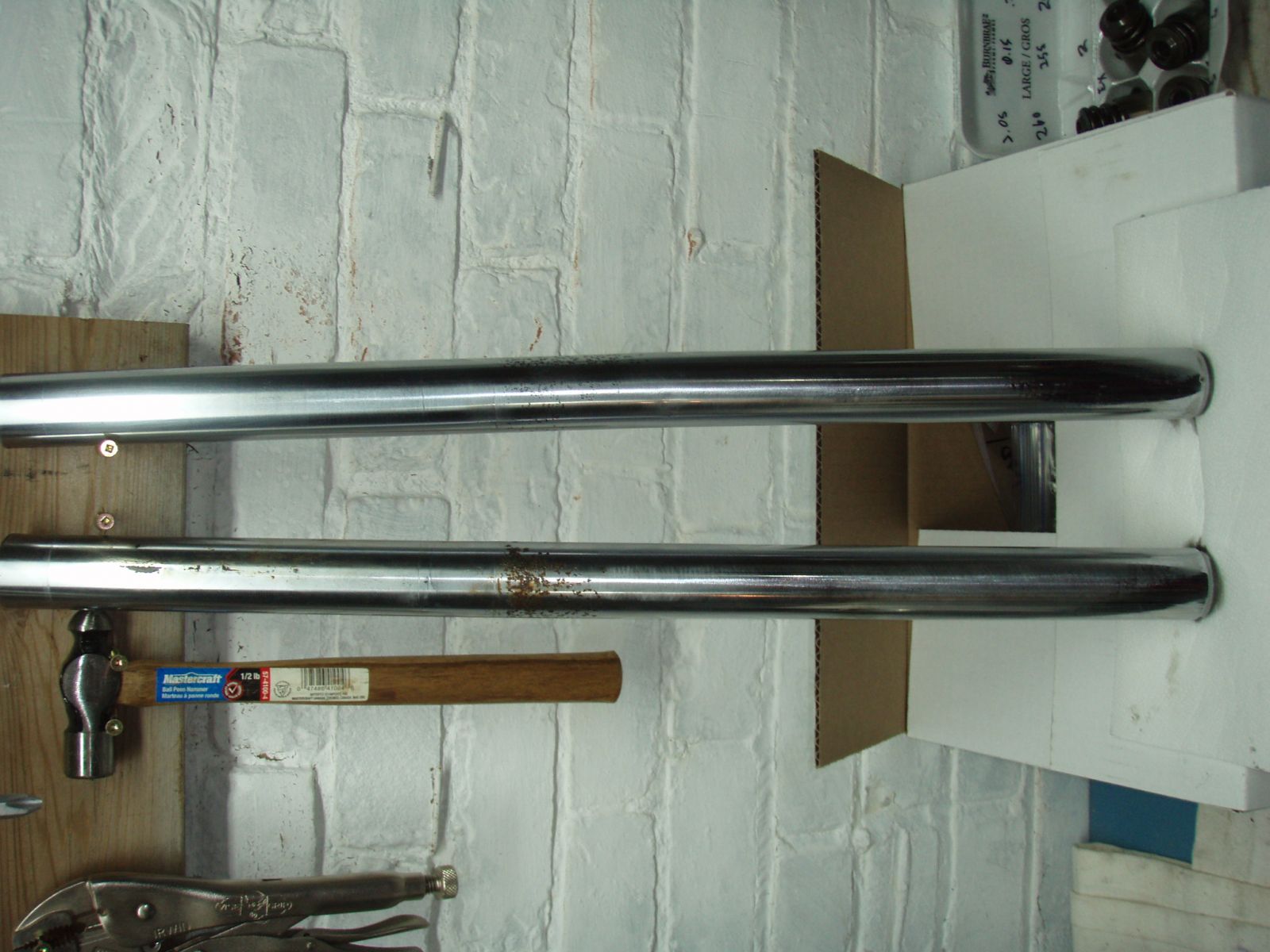 I did the initial cleaning with a green scotch pad and Simple Green. It took off a surprising amount of the rust right there. I wanted the tubes to be as close to perfectly smooth as I could make them, in case the oil seal does ever get that high up, I realize that a pit isn't good not matter how you cut it, but better than the raised bubble of rust, which are sure to destroy the new seals pronto. So, anyway, gave them a nice sanding with 400, 600 and 800. Followed up by applying a little rust converter to the pits when all was done in the hopes of retarding any further rusting in the future. I guess I will see. (btw - it is a phophoric acid based solution which make an iron phosphate out of the remaining rust. Much harder than rust, and supposedly resistant to further oxidation...)