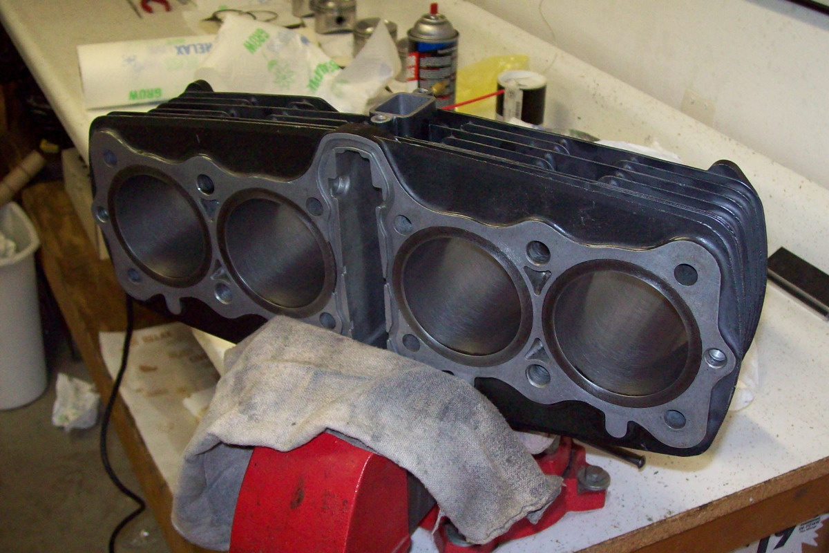 The cylinder has been freshly honed. Got a real nice cross-hatch pattern. Smokey would definitely approve of the way it came out. I forgot how messy honing really is!!! I got little drops of honing oil all over my nice clean bench, and surrounding areas.