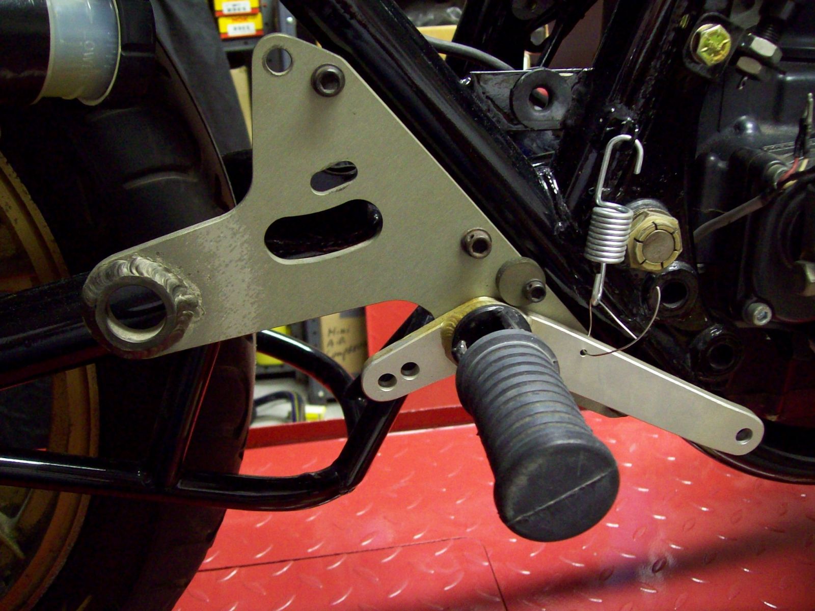 Did a weekend thrash on the Kz. Got my shifter side all worked out. It came out pretty clean looking I think. It still shifts 1 down and 4 up too!! Now my brake side is turning into a nightmare!!!! My Bassani pipe just has too much upsweep to it to use the stock KZ1000S1 rearset bracket. Well its back to the drawing board on that side. Got to come up with a whole new way for the feetpeg bracket, and brake lever setup. Its back to the cardboard cutouts, and staring at it to come up with a another plan of attack.