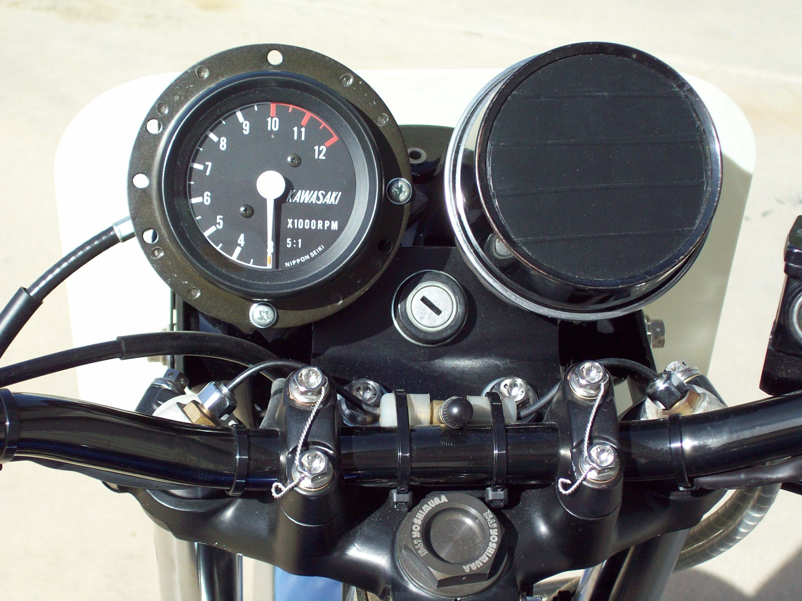 Light weight rearsets are fabricated using KZ1000S1 components. Mark II fuel tank has been reworked to use dual Z1R petcocks. This setup will allow the very last ounce of fuel to be picked up from tank!!! Custom fabricated gauge bracket with a rare KZ1000S1 road race tach. Vintage Yoshimura 1/8 turn Superbike throttle is used to open up the Keihin CR33 carbs. Custom fabricated Bassani Superbike pipe for the ultimate in cornering clearance is used.