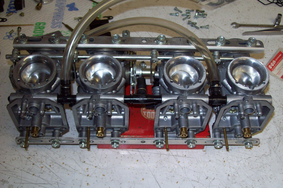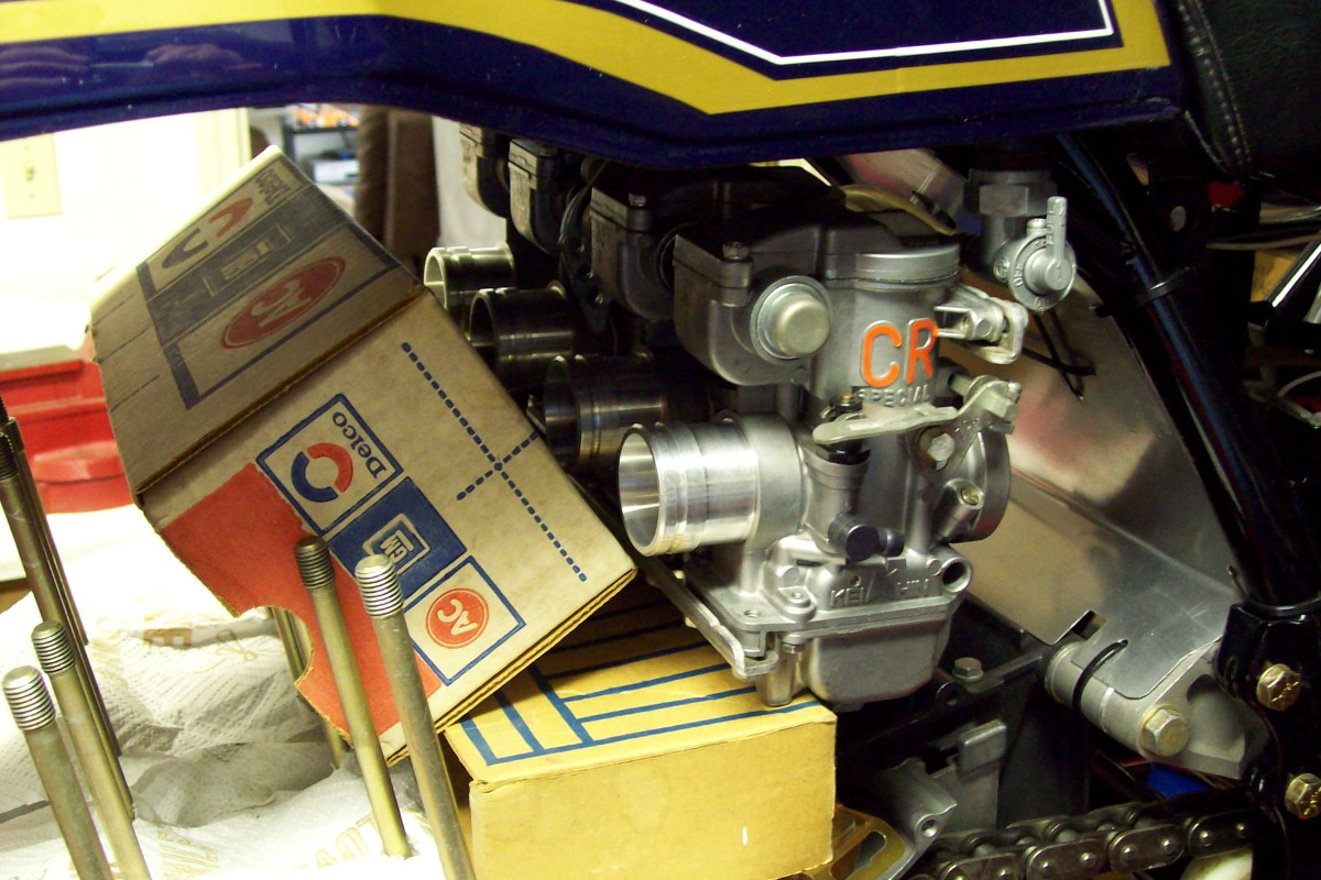 Still waiting on my cylinder head to arrive. So I am getting everything else ready for final assembly. The CR Keihins that I am using on this bike have sat in a box for 32 years, When I fired the bike up last year for the first time, I had some fuel leaking out of the inlet fuel tees. So I decided to replace every O-ring in these carbs. Glad I did!!!!! They were all flat, and mostly hard as rocks. I had all but one O-ring on hand. So I only had to order one O-ring. Plus I decided to lean the jetting out just like I had to for my Mikuni flatslides on my GSXR750. I had to drop 4 main jet sizes just to get a nice plug color. So I did the same on the CR's. Lean is mean.