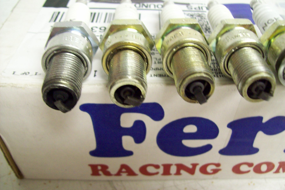 Dr. Gamma wrote: Been cleaning up in my work area. I gathered up all the plugs I have had in my KZ since I started it up with fresh motor. It was STONE RICH when I fired it up for the first time as you can see from the first plug on the left. As I dropped the jets, and changed to different needles, and air correction jets you can see how the plug color started to get lighter, and lighter as I got closer to being right on on the jetting. I started running out of new plugs so I started just changing one plug instead of all four between jet changes.!!! I hate living on a budget. I had my CR's off and on my bike something like 15 times!!!! The very last plug on the right has about 75 miles on it at high speeds. I did a plug chop on that last plug too!!! I think I am pretty close by the color. I am leaving it for now!!!!