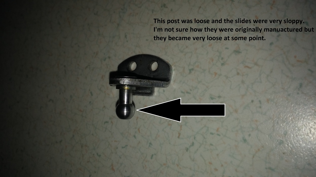 Problem 2: I found (2) loose slides. I was able to wiggle the slides up and down with my finger on the #2 and #3 cylinders. I think this was causing the "stuttering" problem I was having. Those slides were probably rattling around as the air flow increased. One carb had some worn parts in the mechanism that attaches the slide to the throttle shaft. There are a bunch of tiny little parts in the area...it's not solid. There are "ball and socket" type connections with springs and cupped pucks etc... One of the cupped pucks was all beat up and sloppy. The other cylinder was loose from the same problem I had with these before. I don't know if it was the one I fixed or another one, but I had to solder the post on the slide bracket. I'll be looking for some used ones for spares. It was this part: