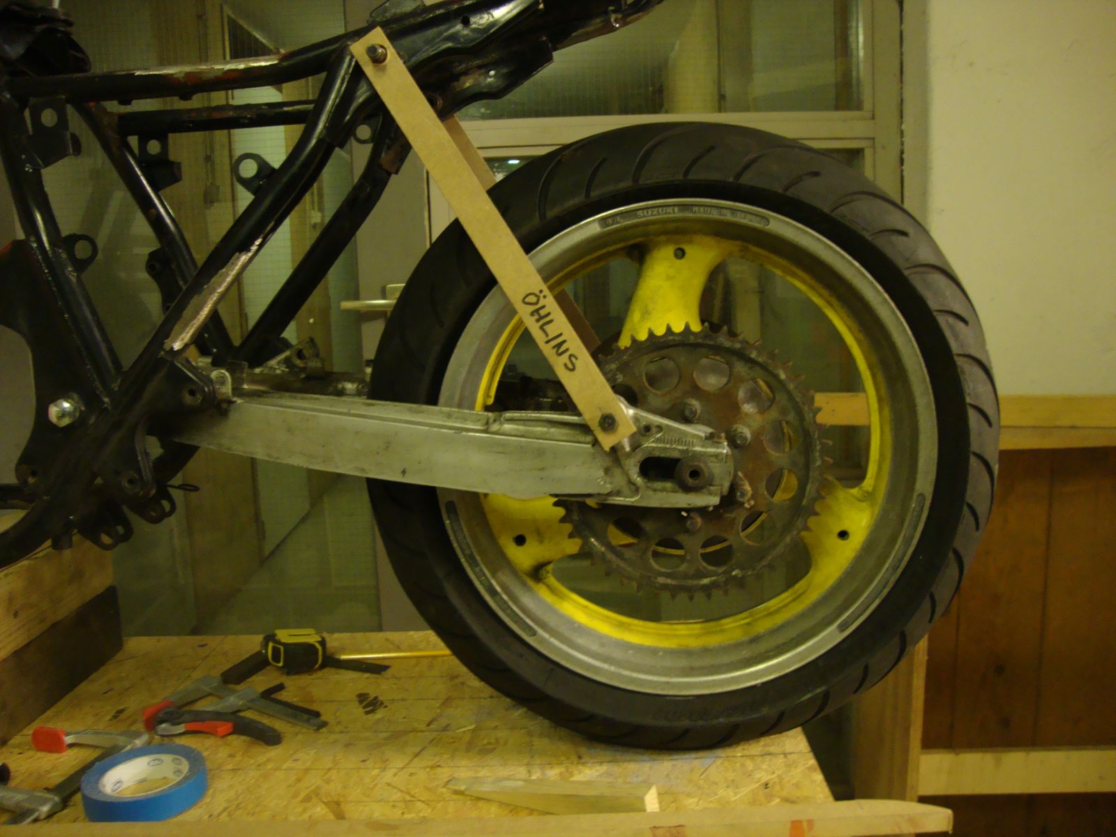 I have no idea how Im going to get this to work. An early model GSXR wheel with a 180 tire in a GS1100e swingarm!!