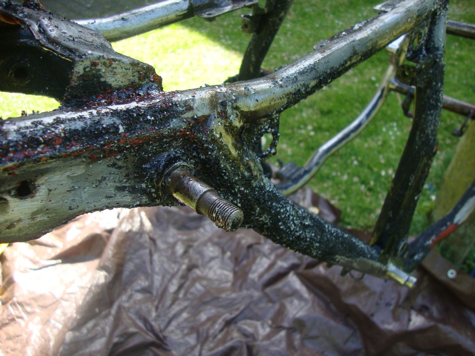 So,today,frame outside and get it stripped. A few false starts with wire brushes and sanders. No good. Paint stripper was the best option.